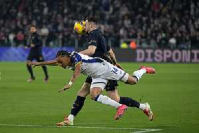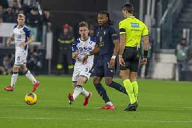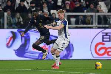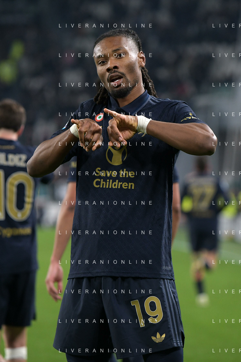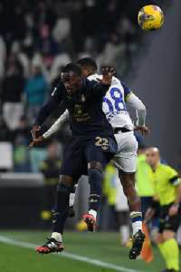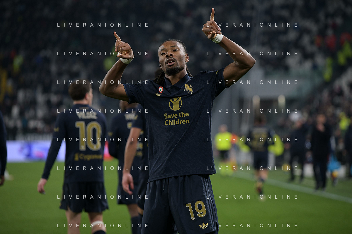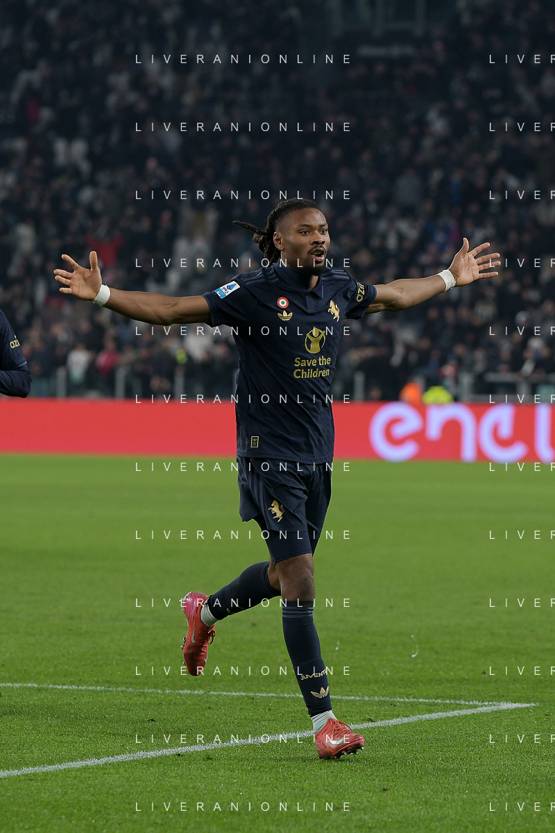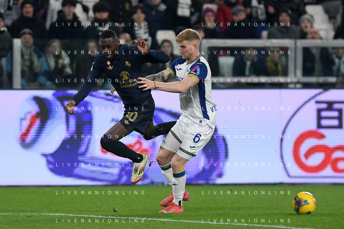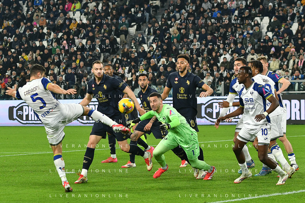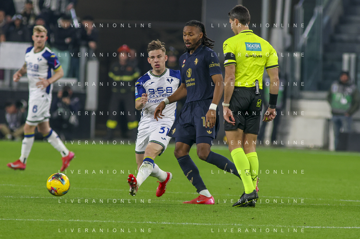 Amin Sarr of Hellas Verona FC competes for the ball with Lloyd Kelly of Juventus FC during Juventus FC vs Hellas Verona FC, 27° Serie A Enilive 2024-25 game at Allianz Stadium in Torino (TO), Italy, on March 03, 2025. (Photo by Davide Casentini) - AG ALDO LIVERANI SAS