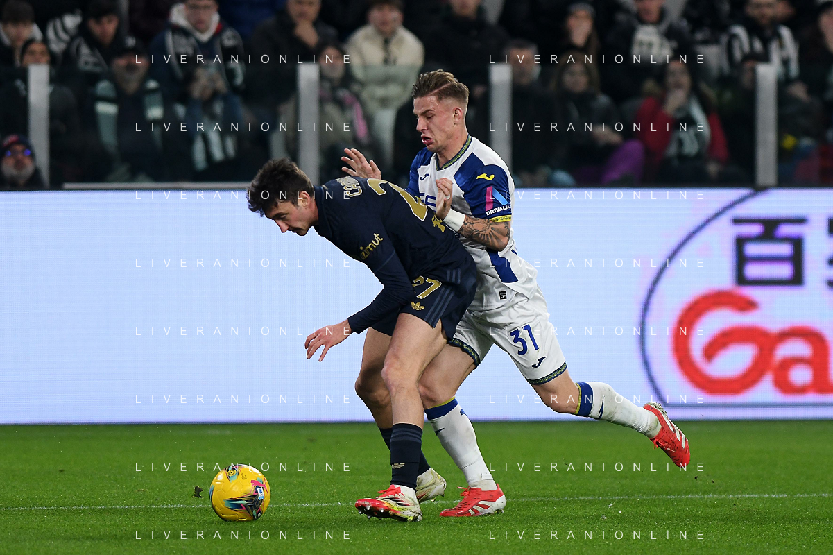 Tomas Suslov of Hellas Verona FC battle for the ball with Manuel Locatelli of Juventus FC during Juventus FC vs Hellas Verona FC, 27° Serie A Enilive 2024-25 game at Allianz Stadium in Torino (TO), Italy, on March 03, 2025. (Photo by Davide Casentini) - AG ALDO LIVERANI SAS