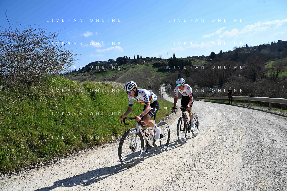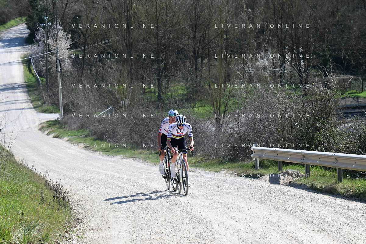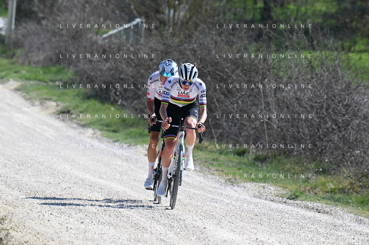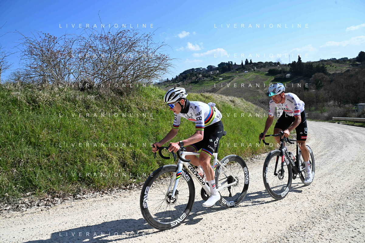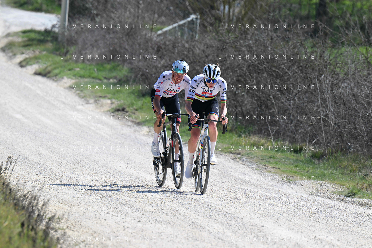 06-03-2025 Allenamento Strade Bianche 2025; 2025, Uae Team Emirates - Xrg; Pogacar, Tadej; Novak, Domen; Le Tolfe; ©SIROTTI - AGENZIA ALDO LIVERANI SAS