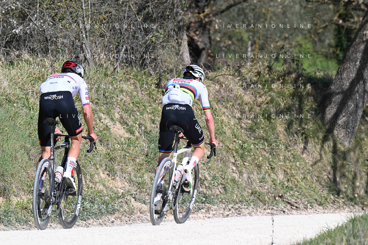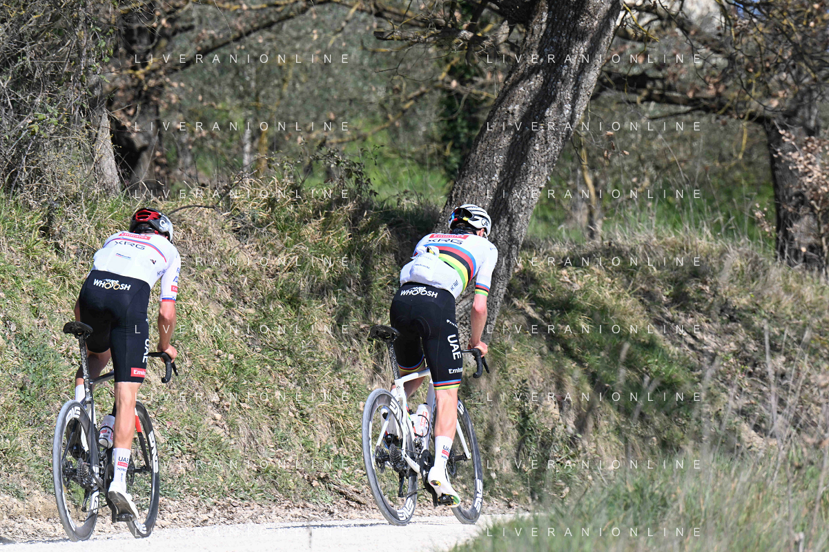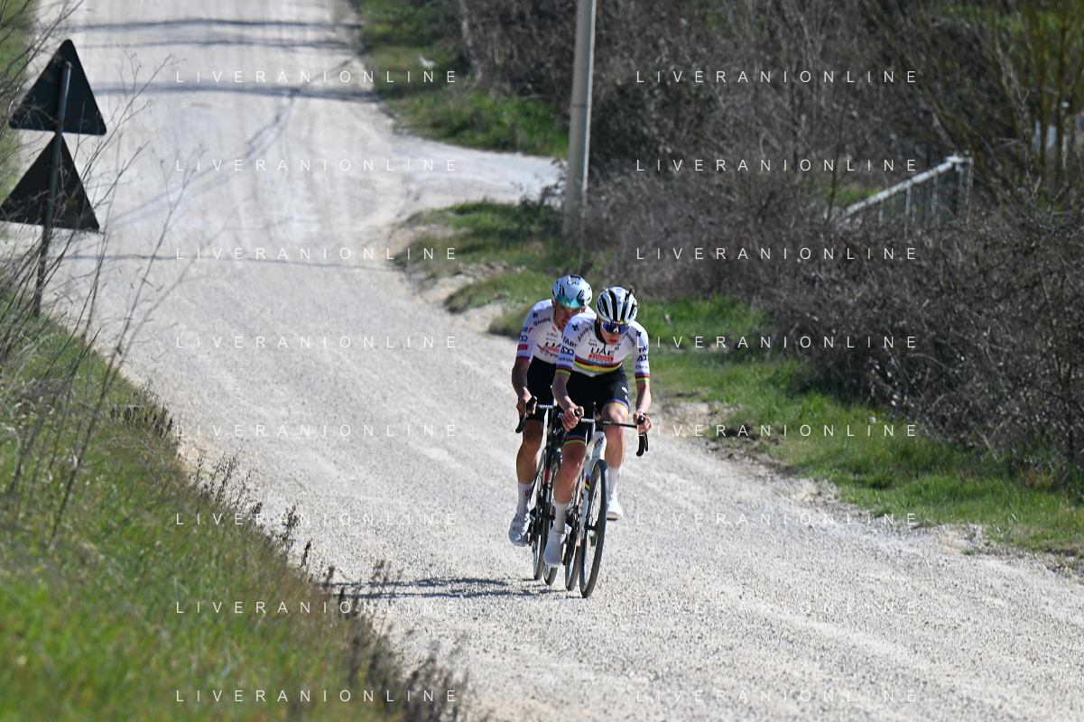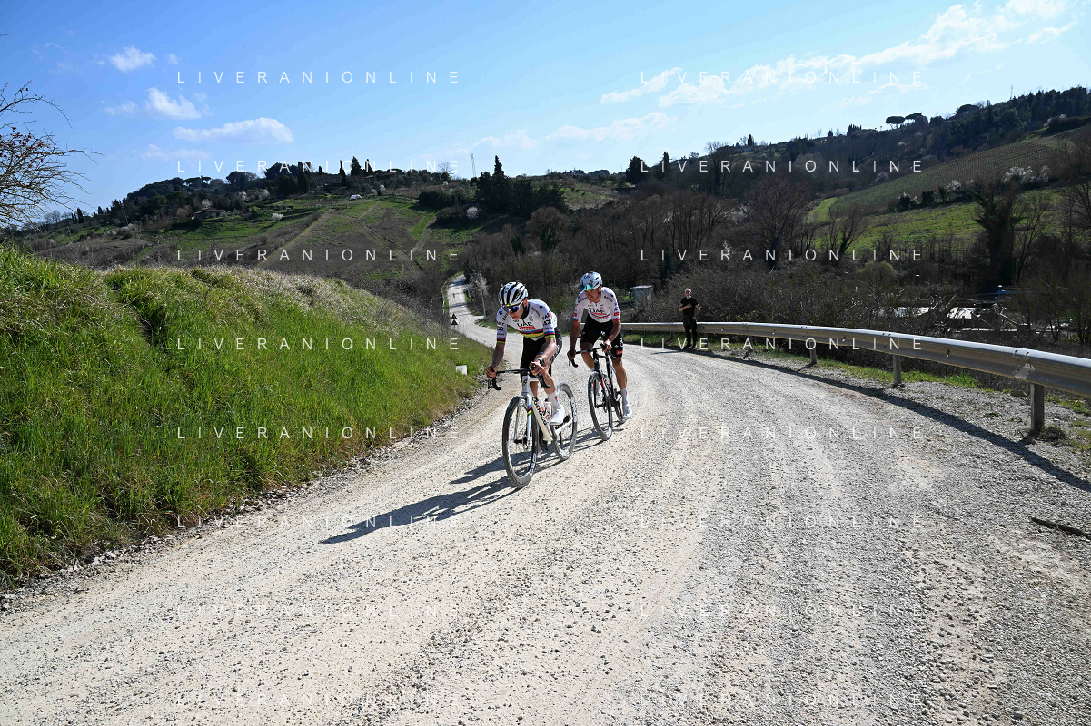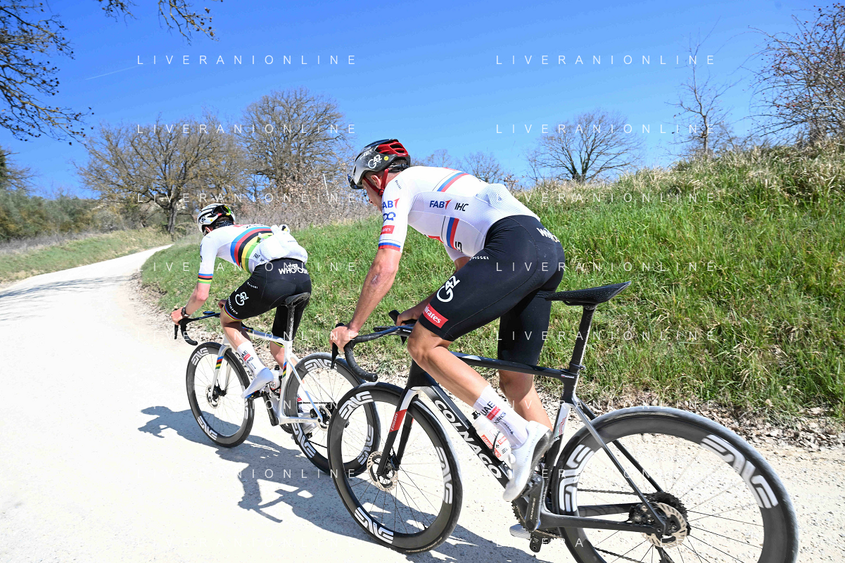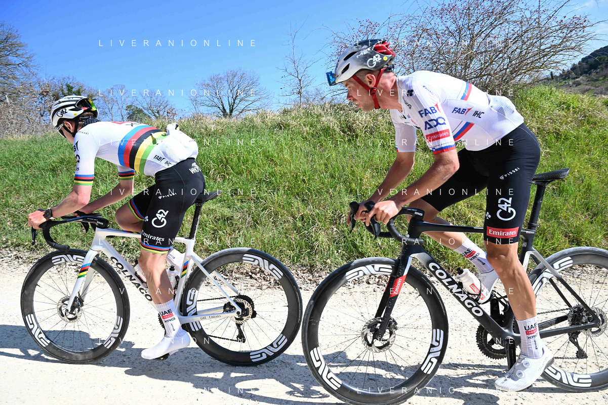 06-03-2025 Allenamento Strade Bianche 2025; 2025, Uae Team Emirates - Xrg; Pogacar, Tadej; Novak, Domen; Le Tolfe; ©SIROTTI - AGENZIA ALDO LIVERANI SAS