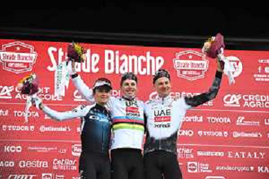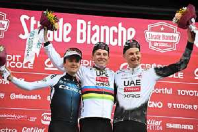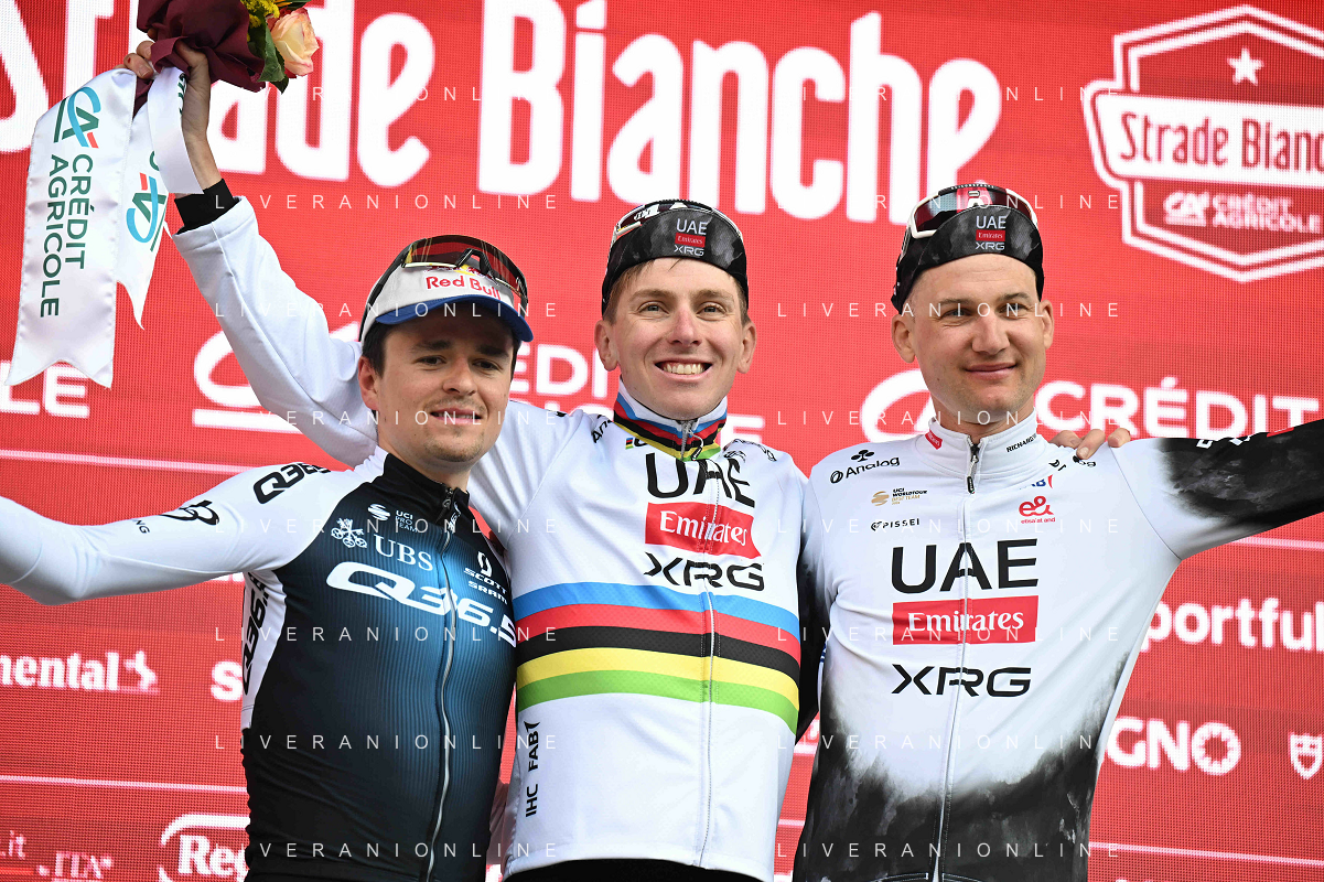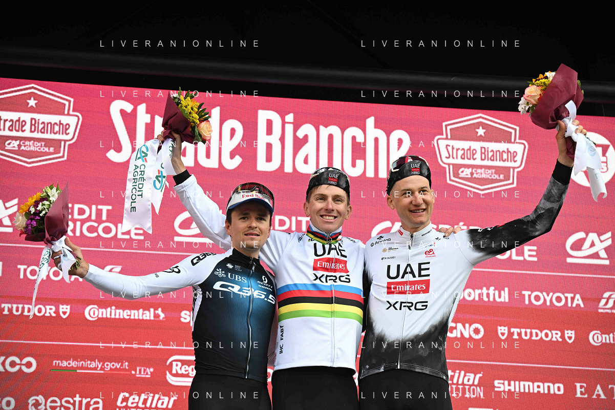 08-03-2025 Strade Bianche; 2025, Uae Team Emirates - Xrg; 2025, Q36.5; Pogacar, Tadej; Pidcock, Thomas; Wellens, Tim; Siena; ©SIROTTI - AGENZIA ALDO LIVERANI SAS