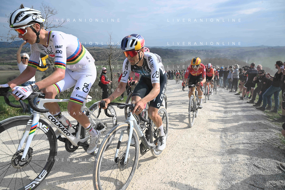 08-03-2025 Strade Bianche; 2025, Uae Team Emirates - Xrg; 2025, Q36.5; Pogacar, Tadej; Pidcock, Thomas; Lucignano D'asso; ©SIROTTI - AGENZIA ALDO LIVERANI SAS
