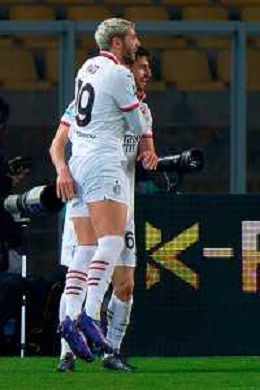 TVEM March 8, 2025 Lecce, Italy - US Lecce vs AC Milan - Italian soccer serie A 2024/25 - Via Del Mare Stadium. In the pic: CMatteo Gabbia of AC Milan celebrates with teammates foto emmanuele mastodonato-ag aldo liverani sas