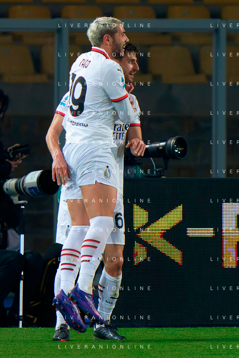 TVEM March 8, 2025 Lecce, Italy - US Lecce vs AC Milan - Italian soccer serie A 2024/25 - Via Del Mare Stadium. In the pic: Theo Hernandez of AC Milan and Matteo Gabbia of AC Milan celebrates foto emmanuele mastodonato-ag aldo liverani sas