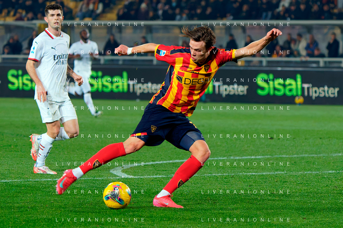 TVEM March 8, 2025 Lecce, Italy - US Lecce vs AC Milan - Italian soccer serie A 2024/25 - Via Del Mare Stadium. In the pic: Christian Pulisic of AC Milan scores a goal of 2-3 foto emmanuele mastodonato-ag aldo liverani sas