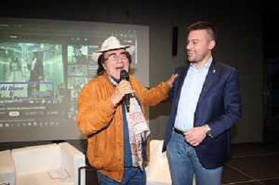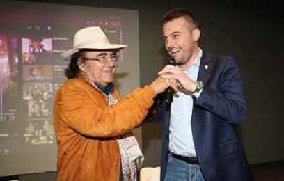 IMOLA 09 03 2025 AUTODROMO ENZO E DINO FERRARI ALBANO CARRISI PRESENTA IL SUO LIBRO NELLA FOTO ALBANO CARRISI E SINDACO MARCO PANIERI CANTANO LA CANZONE FELICITA' ©SANNA - AGENZIA ALDO LIVERANI SAS