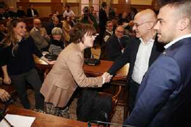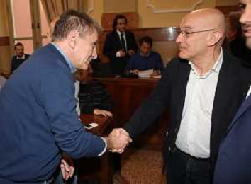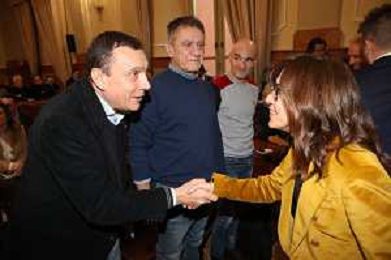IMOLA 14-03 2025 CONSIGLIO COMUNALE SANITA' PRESENZA DI ASSESSORE ALLA SANITA' REGIONALE EMILIA ROMAGNA MASSIMO FABI NELLA FOTO ASSESSORE REGIONALE DELLA SANITA' MASSIMO FABI SALUTA SONIA MANARESI COMMISSIONE SANITA' DEL COMUNE DI IMOLA CONSIGLIERA PD FOTO GIANNI SANNA-AG ALDO LIVERANI SAS