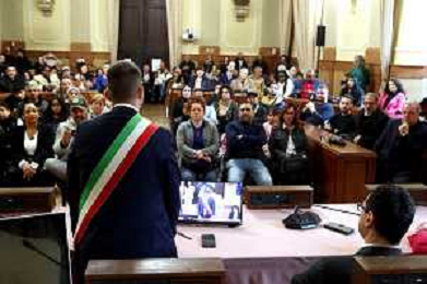 IMOLA 15 03 2025 si e’ svolta la cerimonia in Comune per i residenti a Imola di origine straniera che hanno ottenuto la cittadinanza italiana. NELLA FOTO SINDACO MARCO PANIERI CON I NUOVI CITTADINI ITALIANI