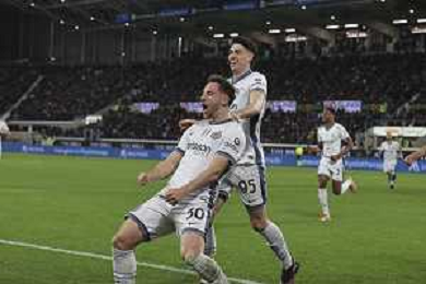 Carlos Augusto of Inter FC scores a goal during Atalanta BC vs Internazionale FC, 29° Serie A Enilive 2024-25 game at Gewiss stadium in Bergamo (BG), Italy, on March 16, 2025. (Photo by Davide Casentini) AG ALDO LIVERANI SAS