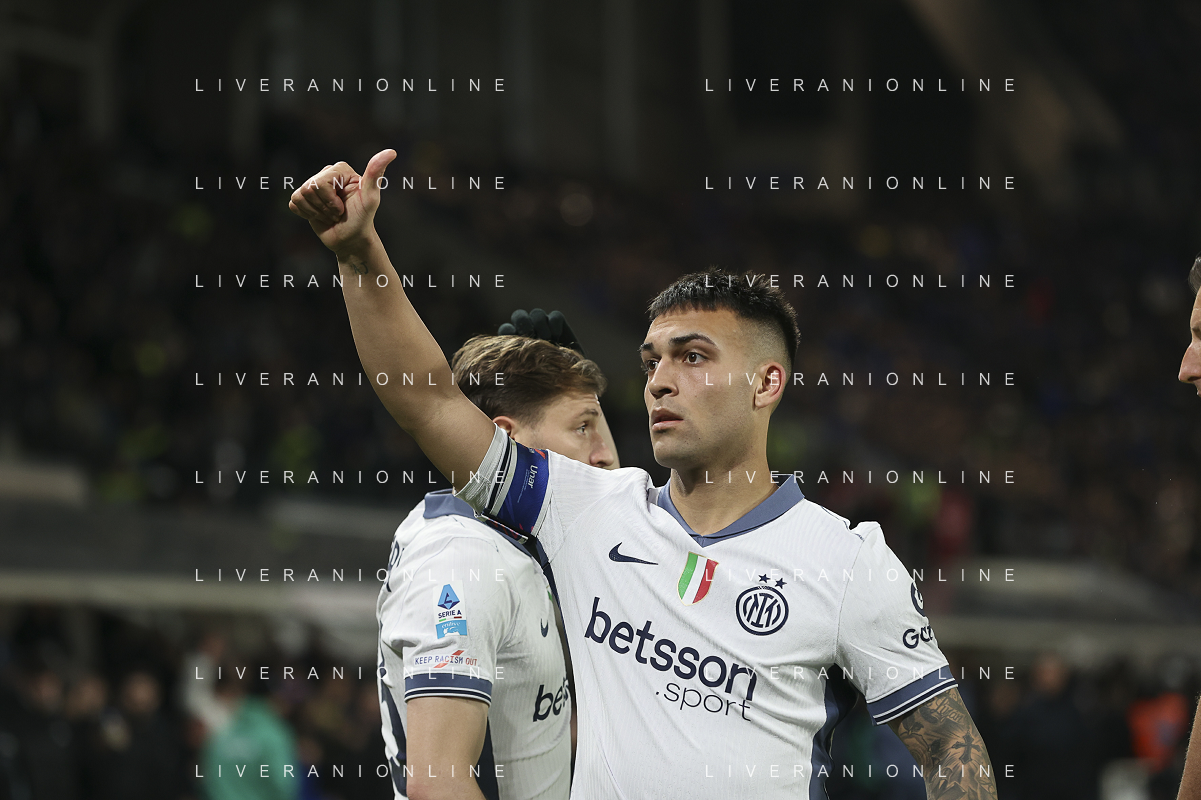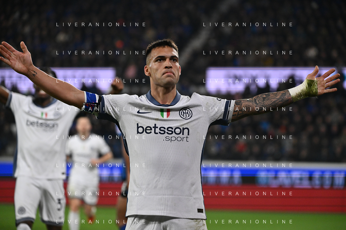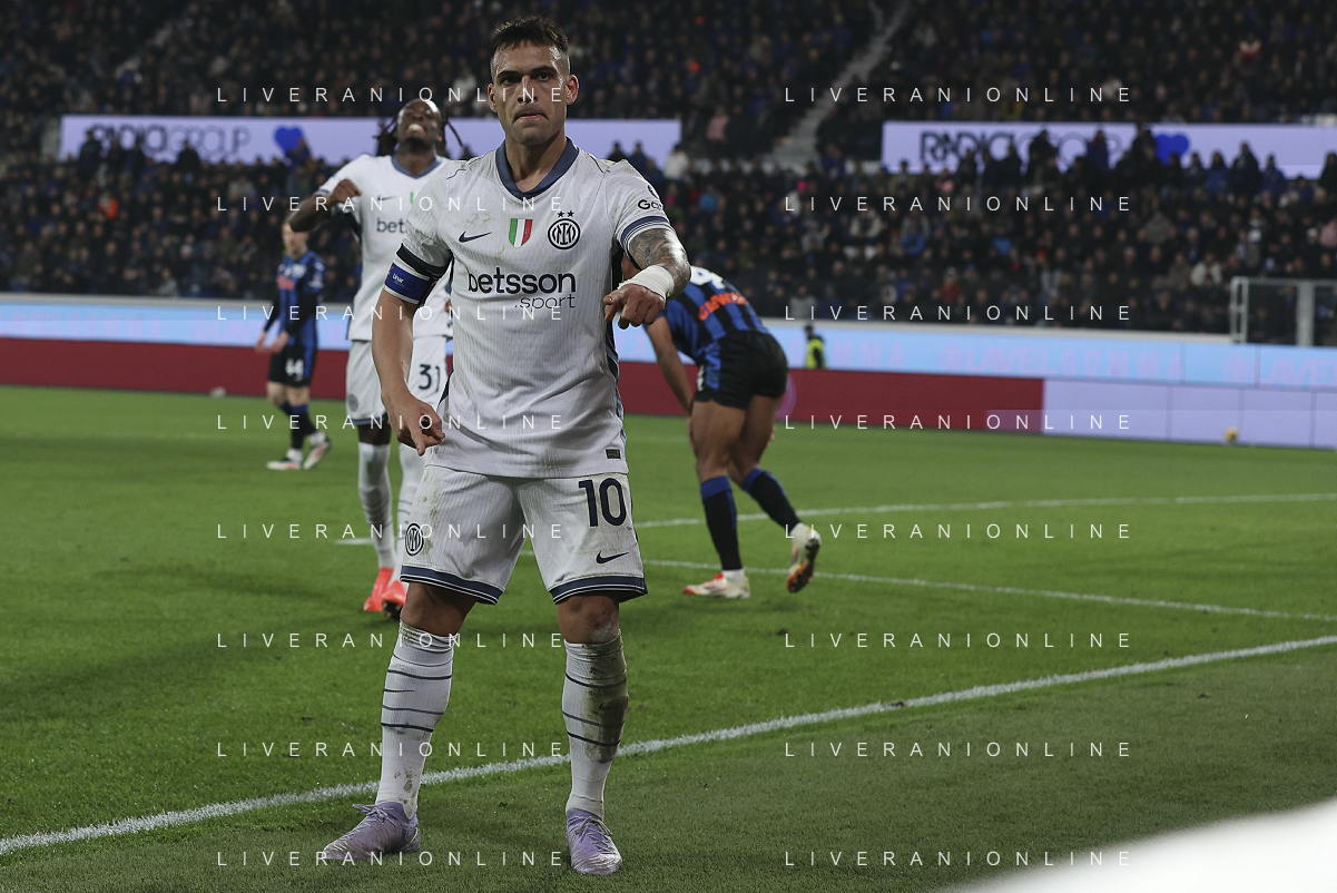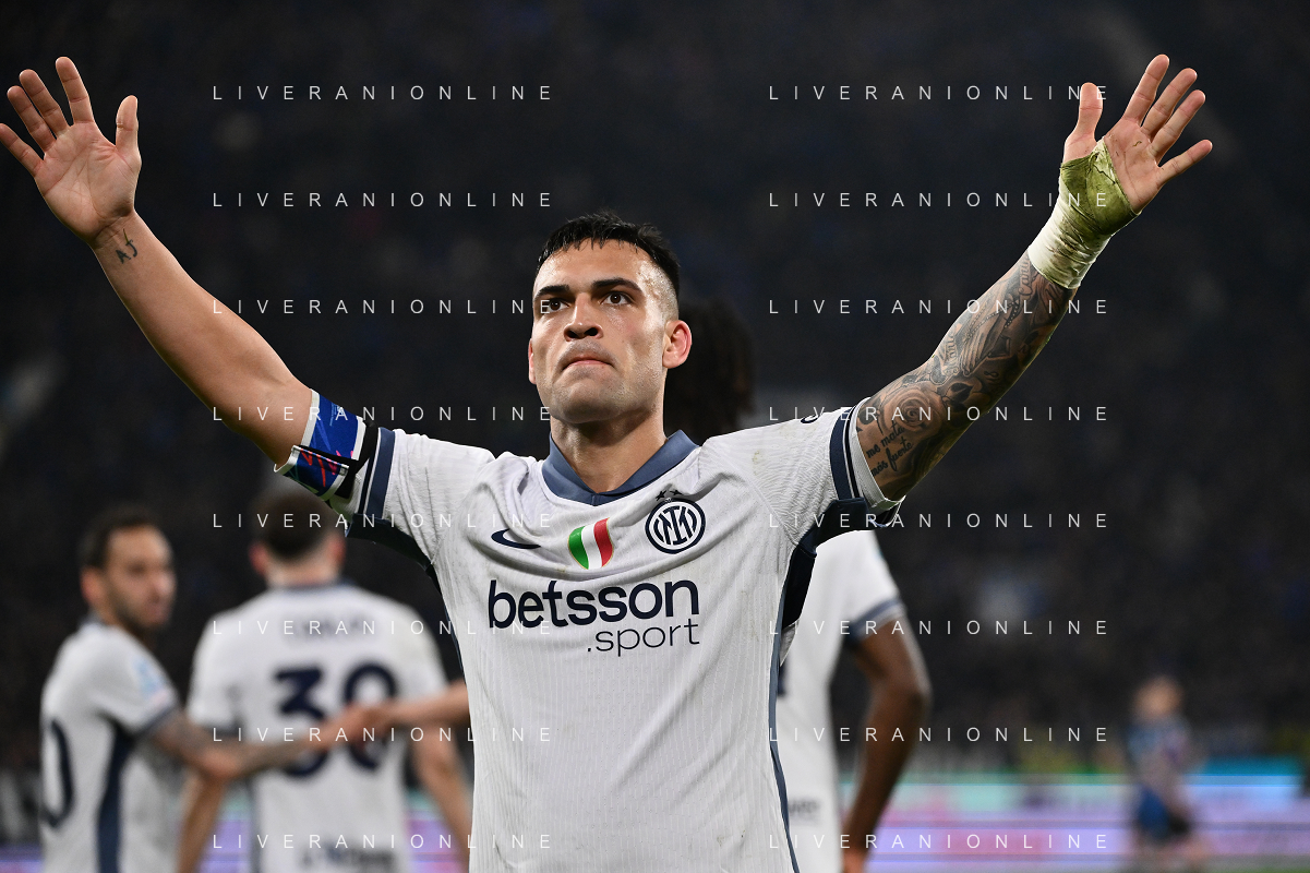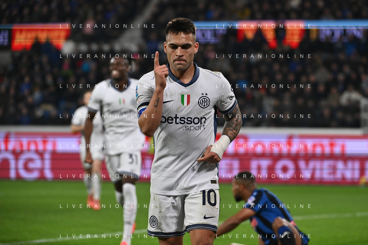 Lautaro Martínez of Inter FC celebrates after scoring goal during Atalanta BC vs Internazionale FC, 29° Serie A Enilive 2024-25 game at Gewiss stadium in Bergamo (BG), Italy, on March 16, 2025. (Photo by Davide Casentini) AG ALDO LIVERANI SAS