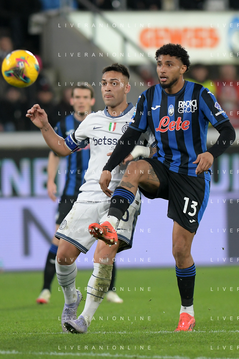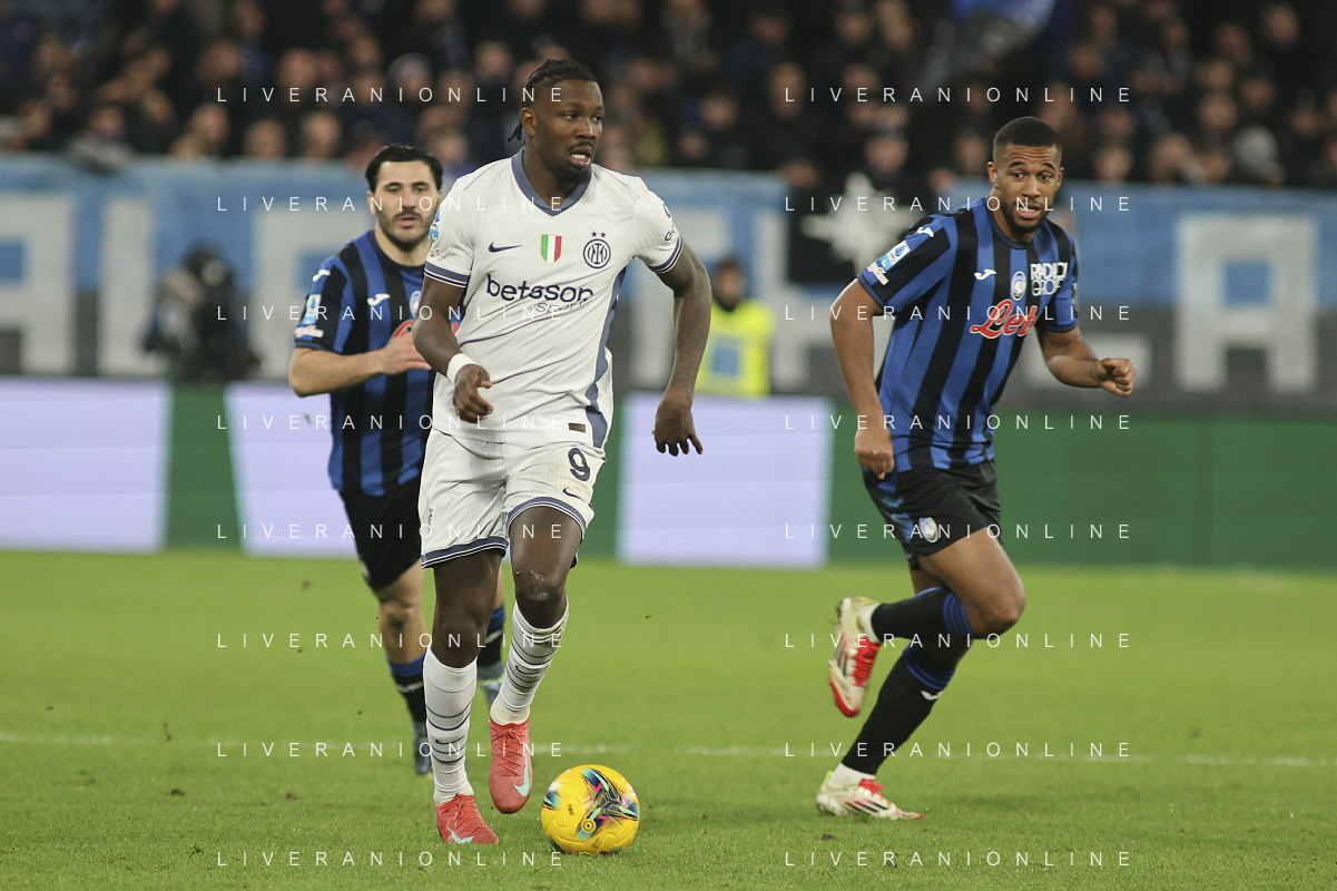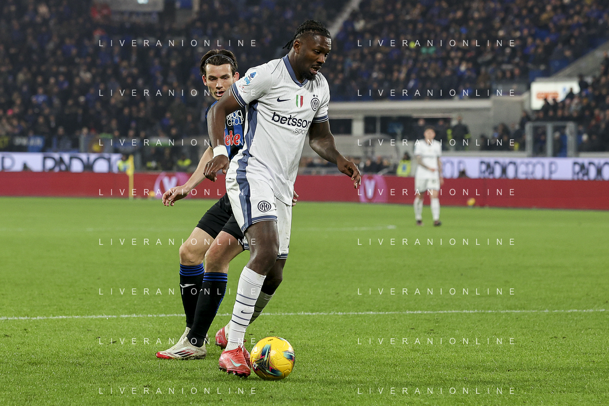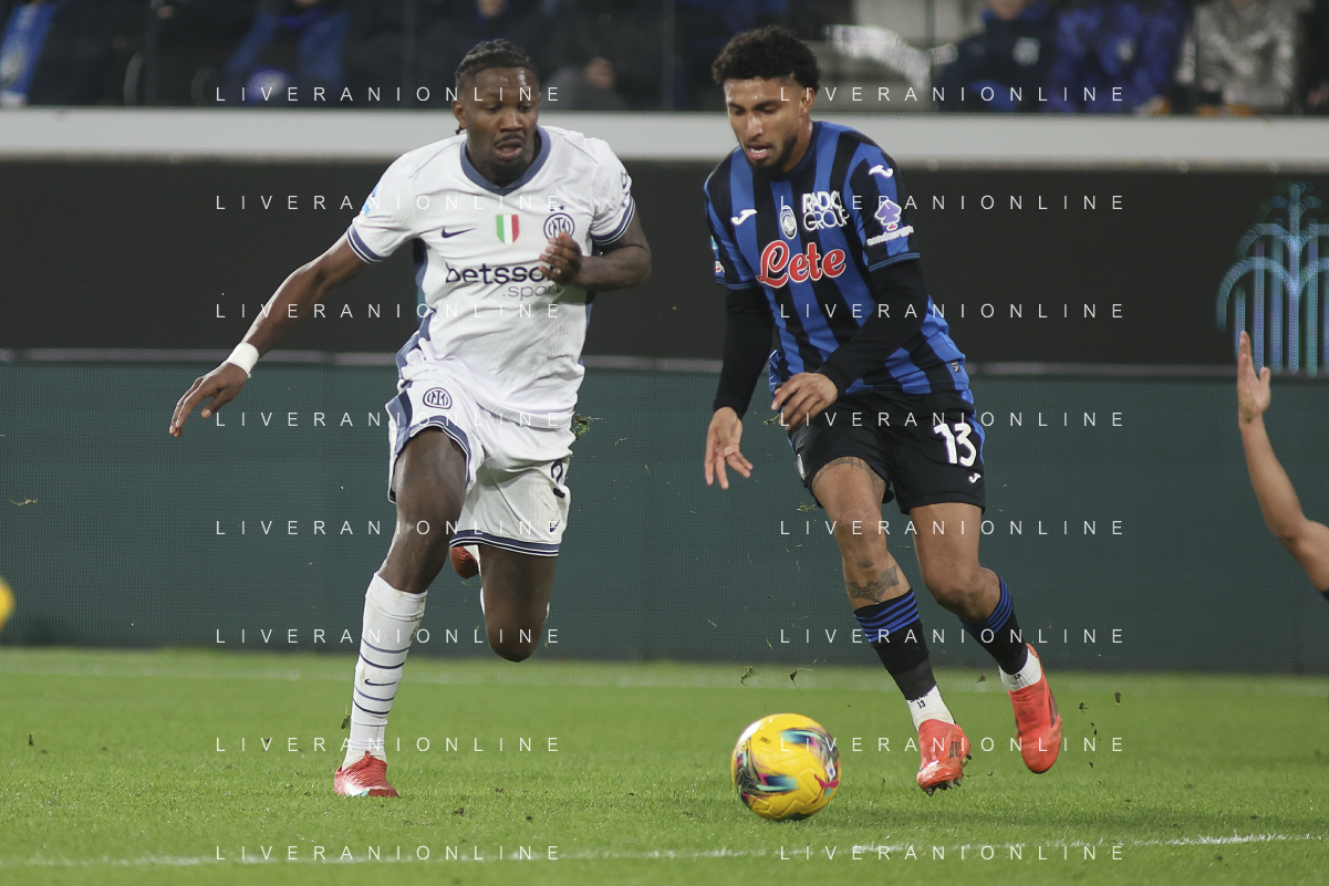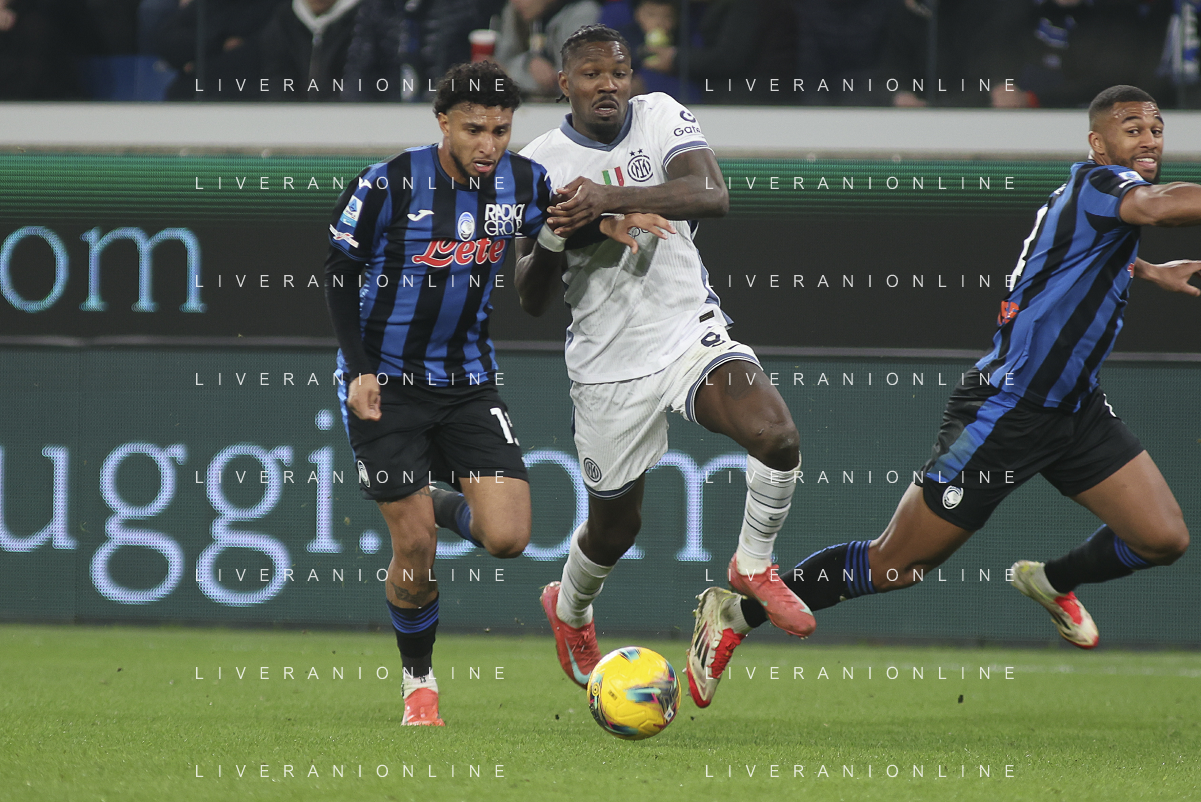 Marcus Thuram of Inter FC battle for the ball with Josè Dos Santos Ederson of Atalanta BC during Atalanta BC vs Internazionale FC, 29° Serie A Enilive 2024-25 game at Gewiss stadium in Bergamo (BG), Italy, on March 16, 2025. (Photo by Davide Casentini) AG ALDO LIVERANI SAS