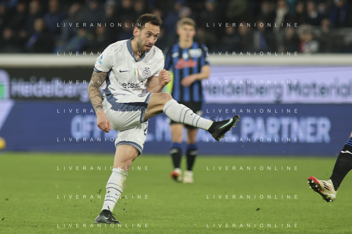 Hakan Çalhanoğlu of Inter FC kick the ball during Atalanta BC vs Internazionale FC, 29° Serie A Enilive 2024-25 game at Gewiss stadium in Bergamo (BG), Italy, on March 16, 2025. (Photo by Davide Casentini) AG ALDO LIVERANI SAS