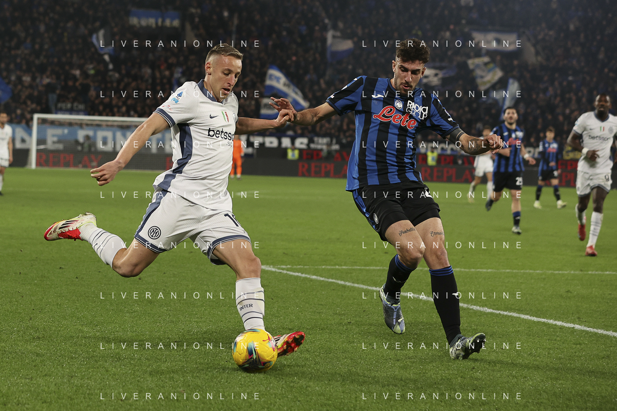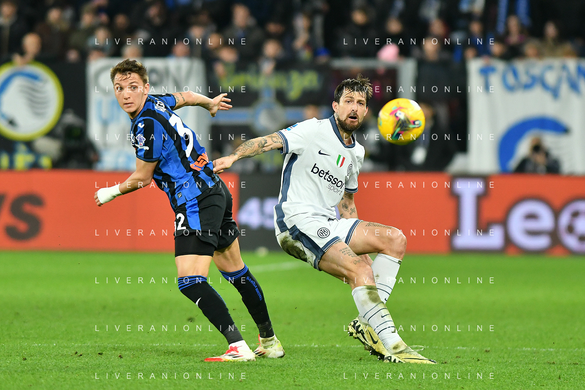 Davide Frattesi of Inter FC competes for the ball with Matteo Ruggeri of Atalanta BC during Atalanta BC vs Internazionale FC, 29° Serie A Enilive 2024-25 game at Gewiss stadium in Bergamo (BG), Italy, on March 16, 2025. (Photo by Davide Casentini) AG ALDO LIVERANI SAS