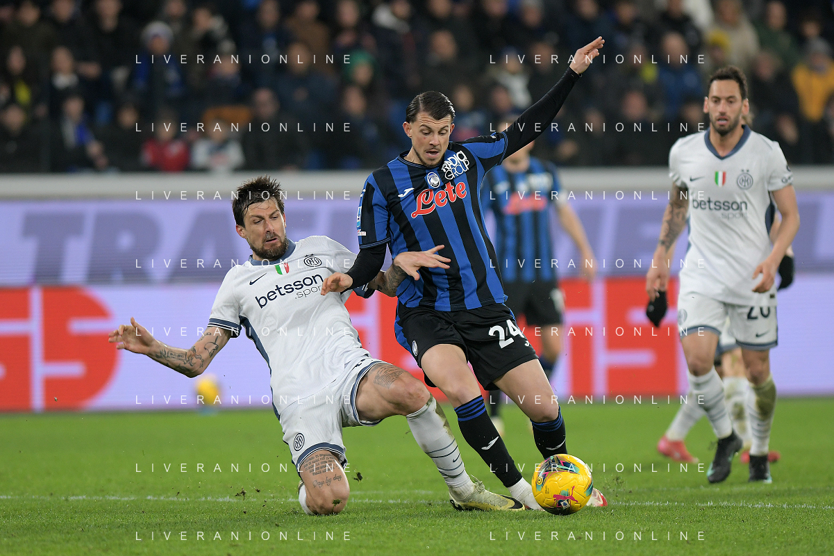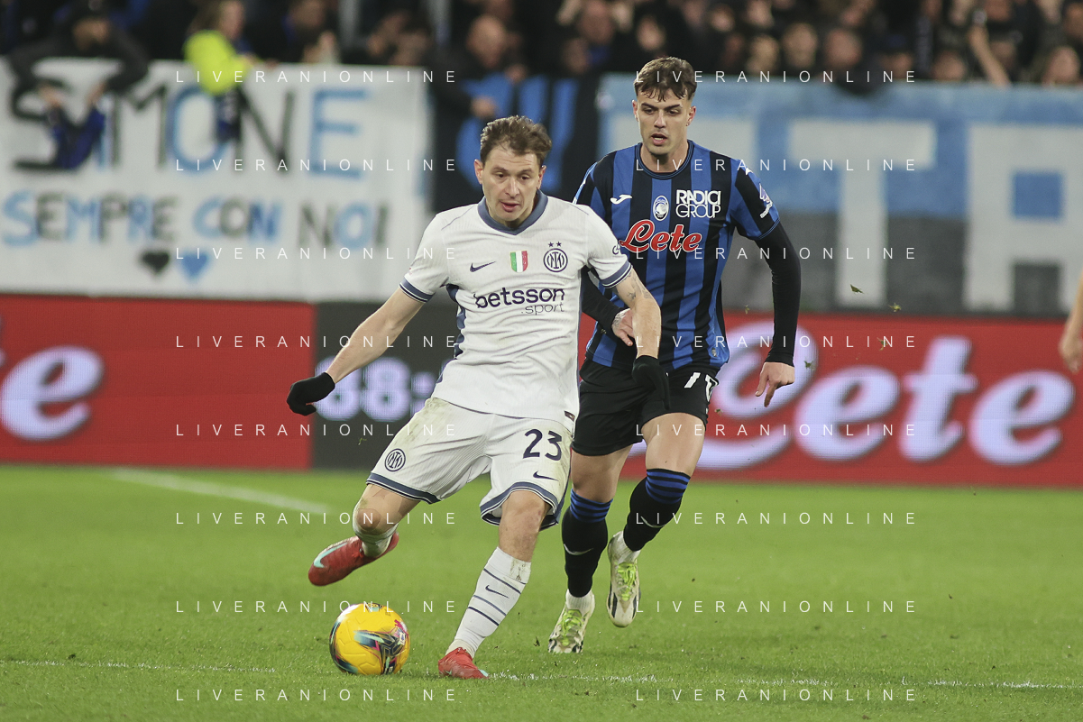Nicolò Barella of Inter FC competes for the ball with Sead Kolasinac of Atalanta BC during Atalanta BC vs Internazionale FC, 29° Serie A Enilive 2024-25 game at Gewiss stadium in Bergamo (BG), Italy, on March 16, 2025. (Photo by Davide Casentini) AG ALDO LIVERANI SAS