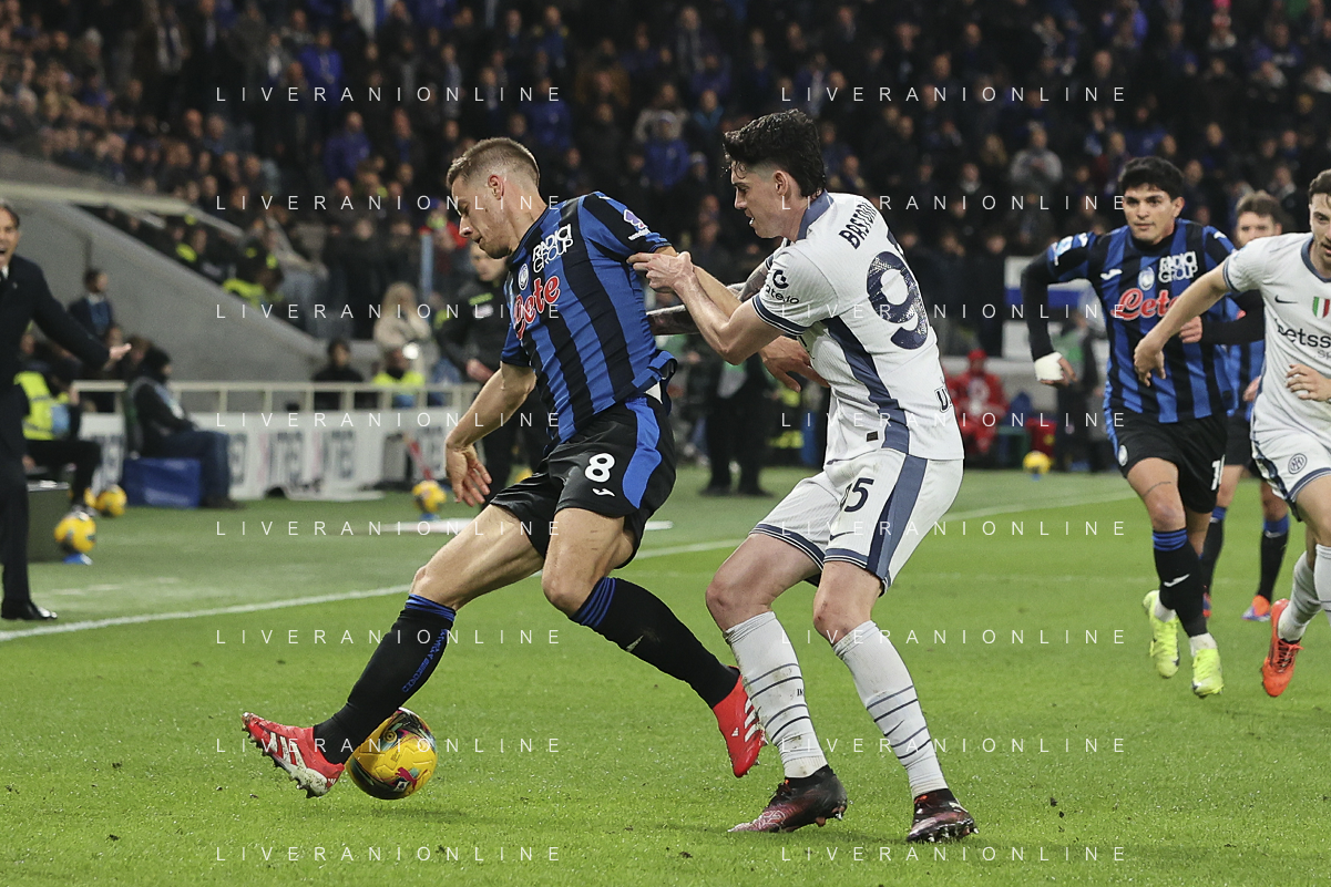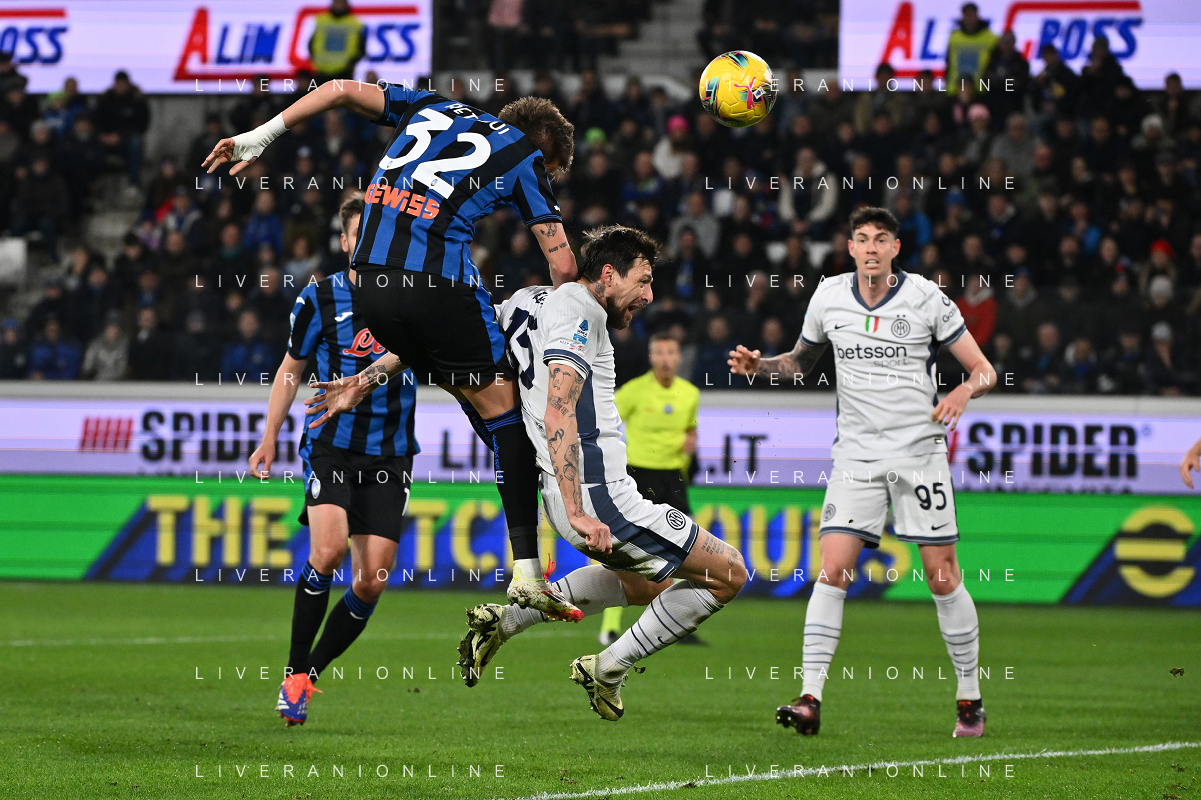 Mario Pasalic of Atalanta BC battle for the ball with Alessandro Bastoni of Inter FC during Atalanta BC vs Internazionale FC, 29° Serie A Enilive 2024-25 game at Gewiss stadium in Bergamo (BG), Italy, on March 16, 2025. (Photo by Davide Casentini) AG ALDO LIVERANI SAS