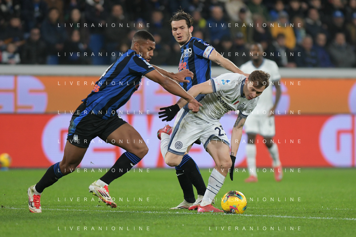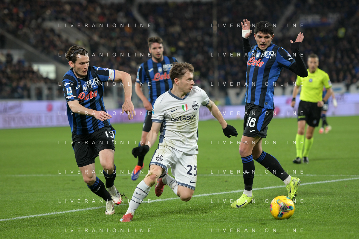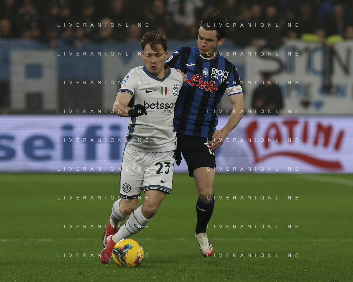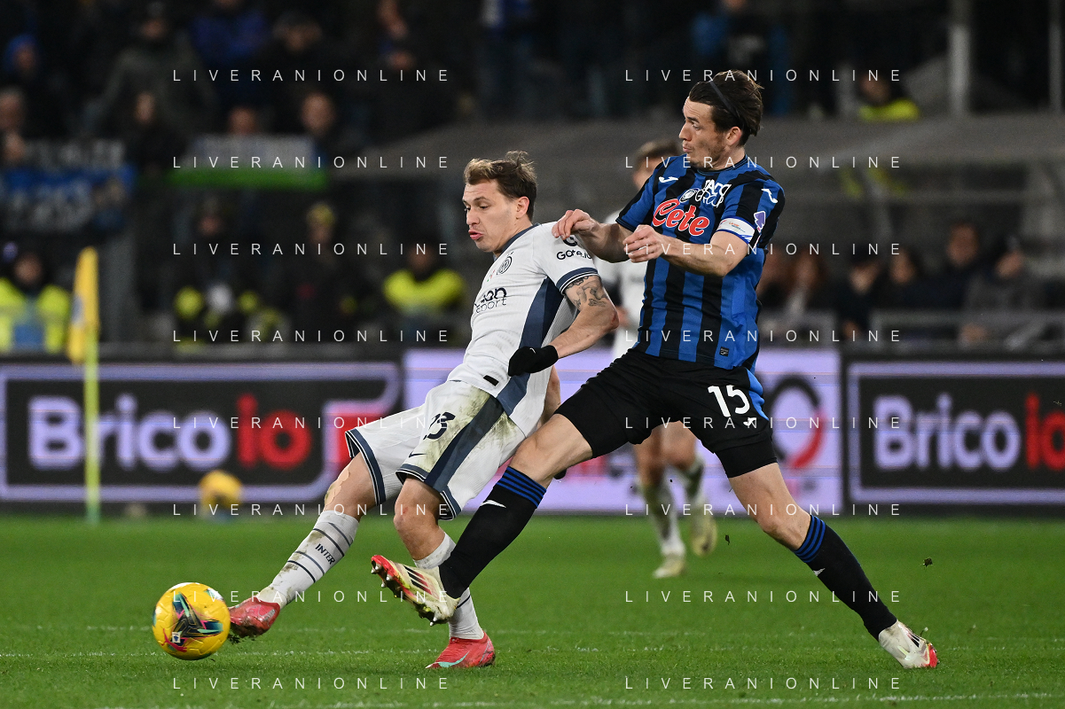 Nicolò Barella of Inter FC battle for the ball with Marten de Roon of Atalanta BC during Atalanta BC vs Internazionale FC, 29° Serie A Enilive 2024-25 game at Gewiss stadium in Bergamo (BG), Italy, on March 16, 2025. (Photo by Davide Casentini) AG ALDO LIVERANI SAS