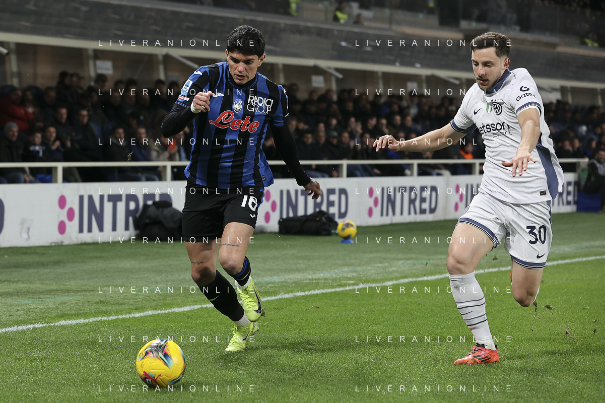 Raul Bellanova of Atalanta BC competes for the ball with Carlos Augusto of Inter FC during Atalanta BC vs Internazionale FC, 29° Serie A Enilive 2024-25 game at Gewiss stadium in Bergamo (BG), Italy, on March 16, 2025. (Photo by Davide Casentini) AG ALDO LIVERANI SAS