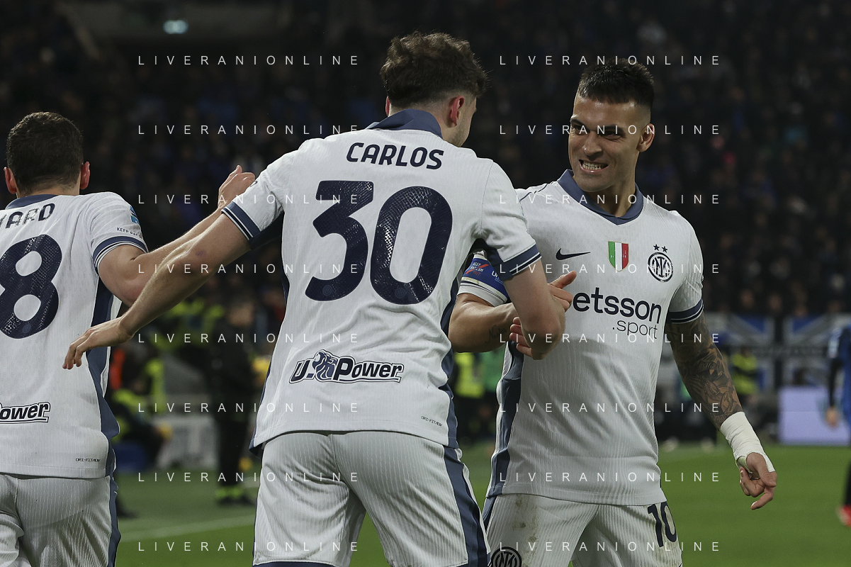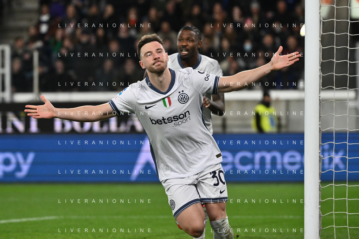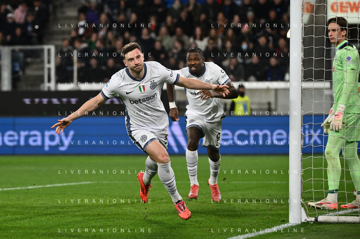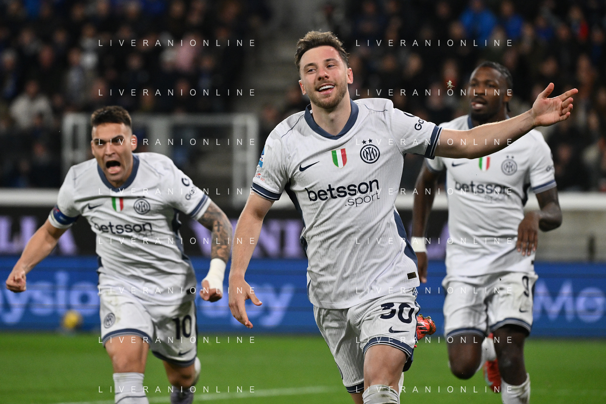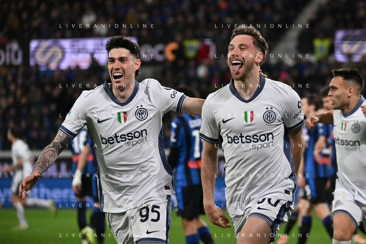 Atalanta vs Inter nella foto Alessandro Bastoni (Inter) e Carlos Augusto (Inter) esultanza dopo il gol dell'1 a 0 Bergamo 16-03-2025 Gewiss Stadium Campionato Serie A Enilive - 29a giornata foto Roberto Garavaglia/Agenzia Aldo Liverani sas- AGENZIA ALDO LIVERANI SAS