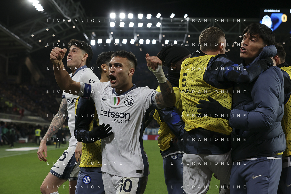 Lautaro Martínez of Inter FC jubilates after goal of Carlos Augusto of Inter FC during Atalanta BC vs Internazionale FC, 29° Serie A Enilive 2024-25 game at Gewiss stadium in Bergamo (BG), Italy, on March 16, 2025. (Photo by Davide Casentini) AG ALDO LIVERANI SAS