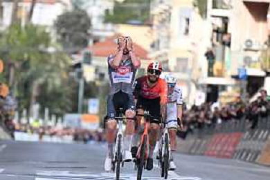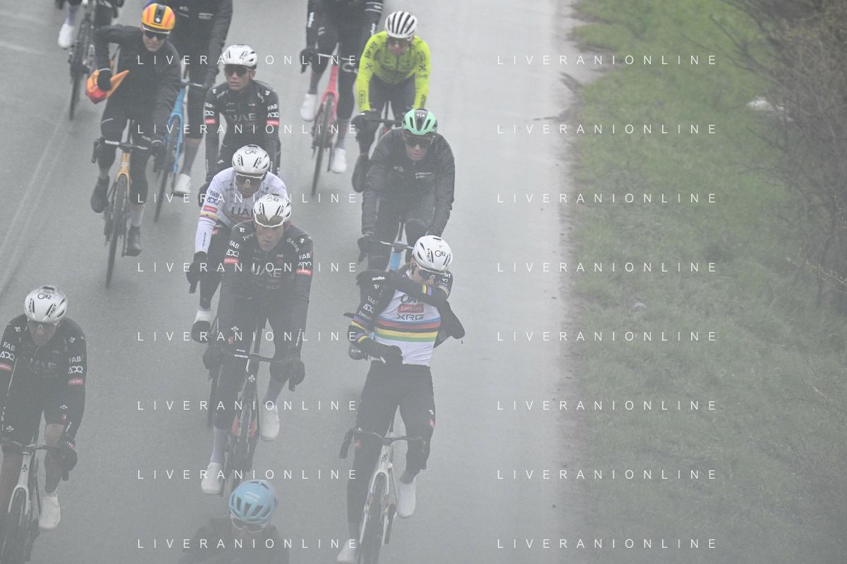 22-03-2025 Milano - Sanremo; 2025, Alpecin - Deceuninck; 2025, Ineos Grenadiers; 2025, Uae Team Emirates - Xrg; Van Der Poel, Mathieu; Ganna, Filippo; Pogacar, Tadej; Sanremo; ©SIROTTI - AGENZIA ALDO LIVERANI SAS