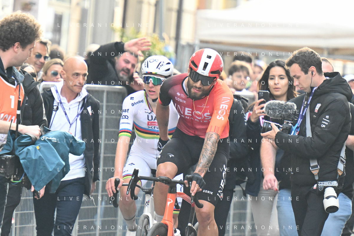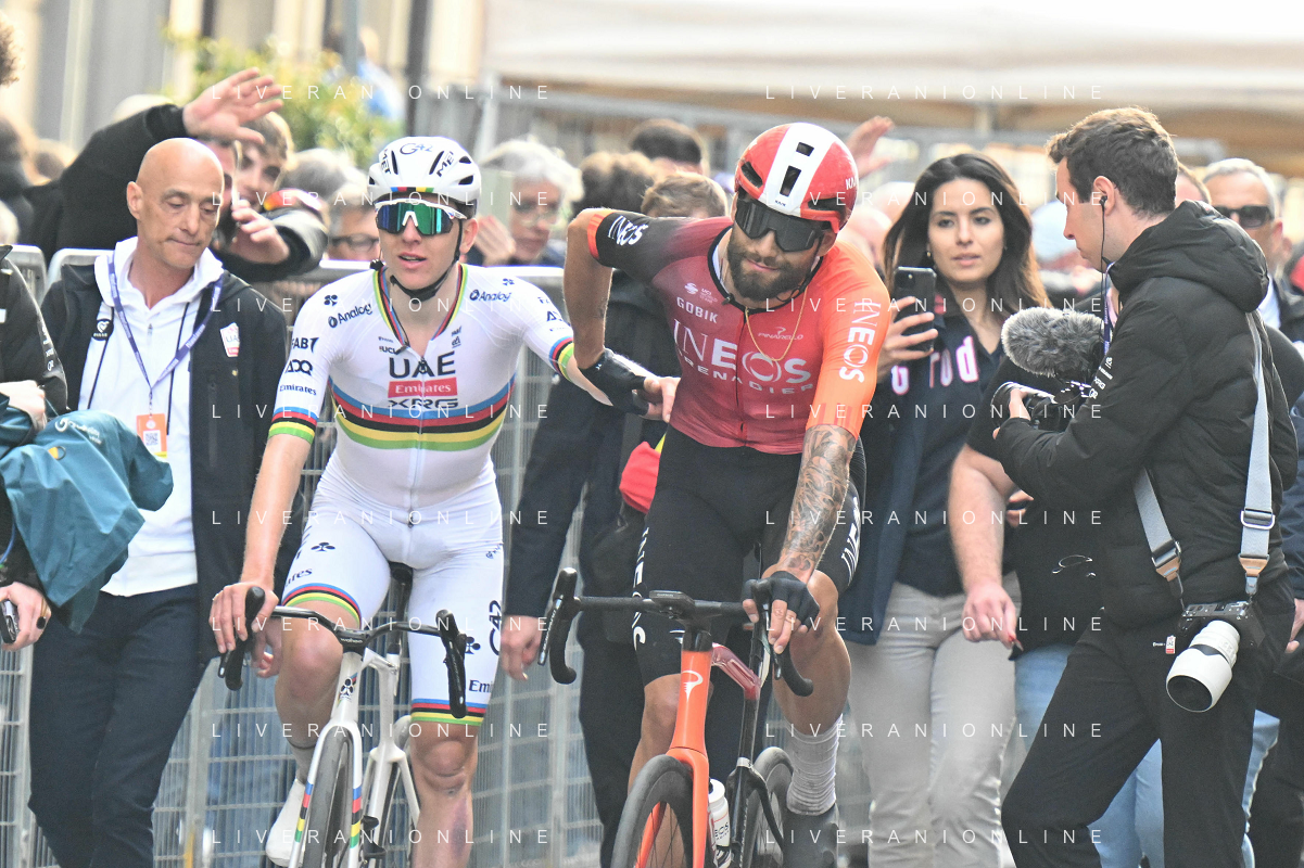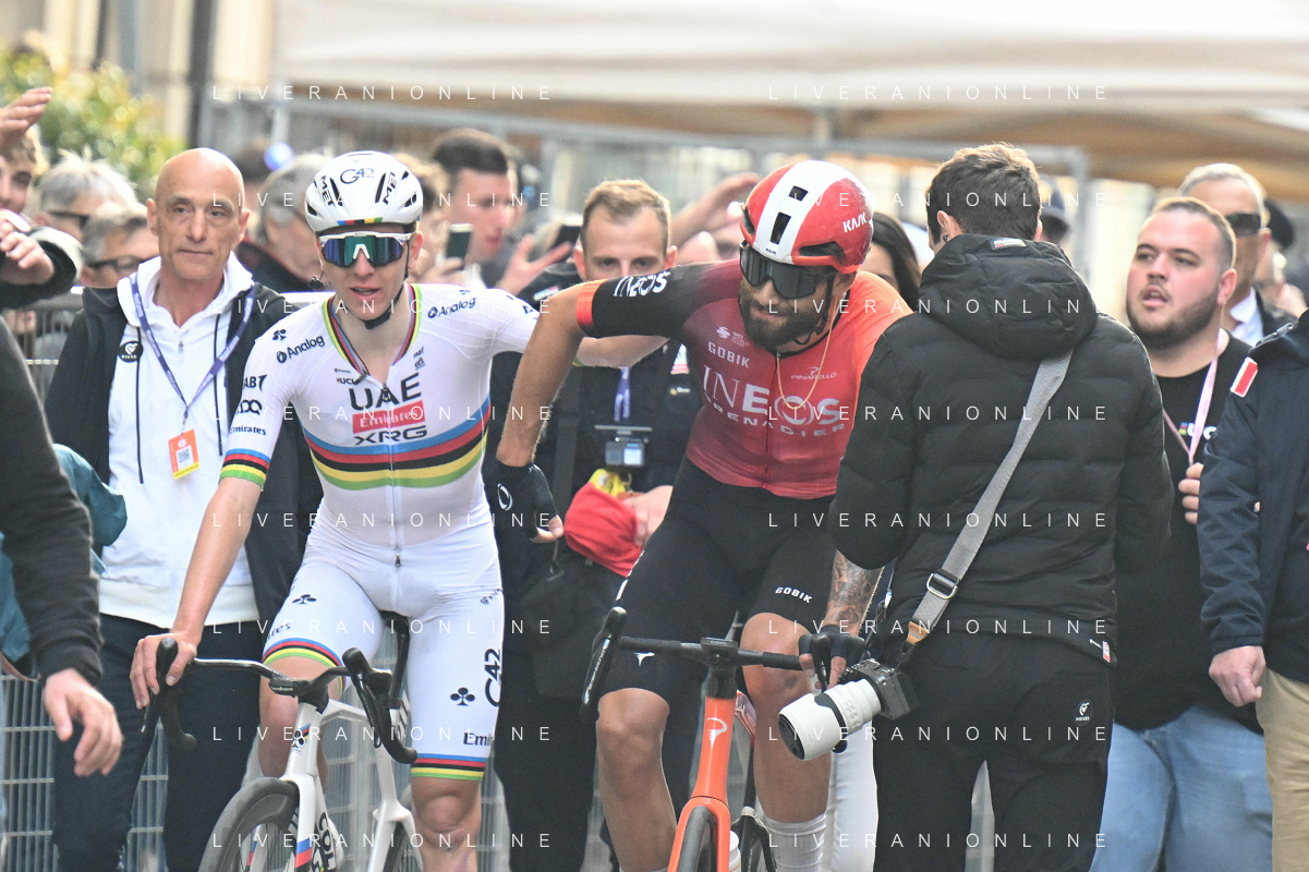 22-03-2025 Milano - Sanremo; 2025, Uae Team Emirates - Xrg; 2025, Ineos Grenadiers; Pogacar, Tadej; Ganna, Filippo; Sanremo; ©SIROTTI - AGENZIA ALDO LIVERANI SAS