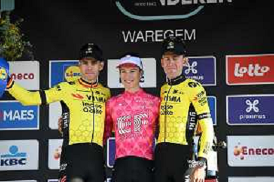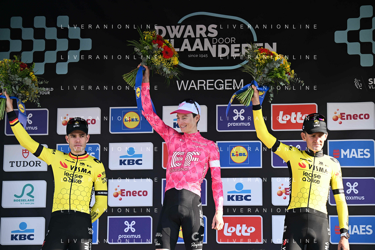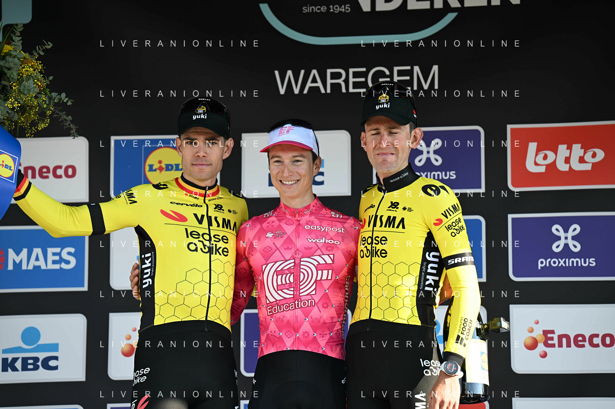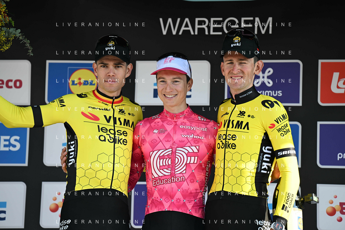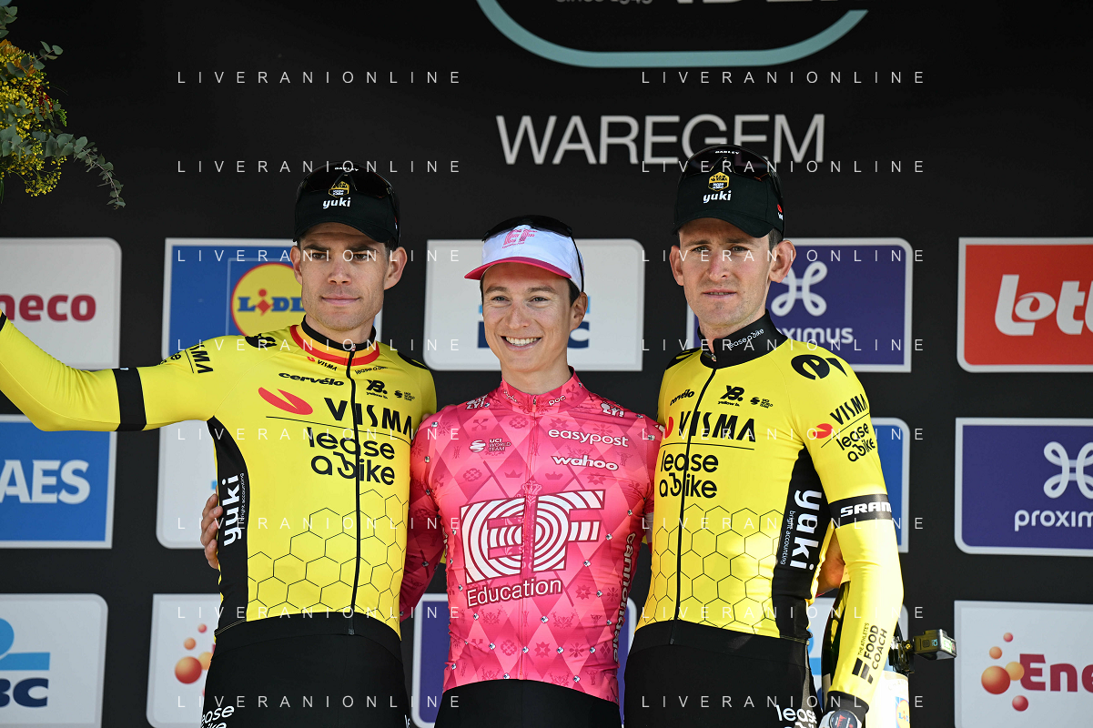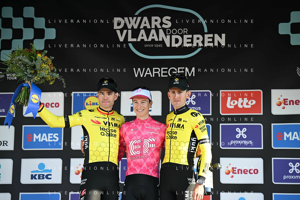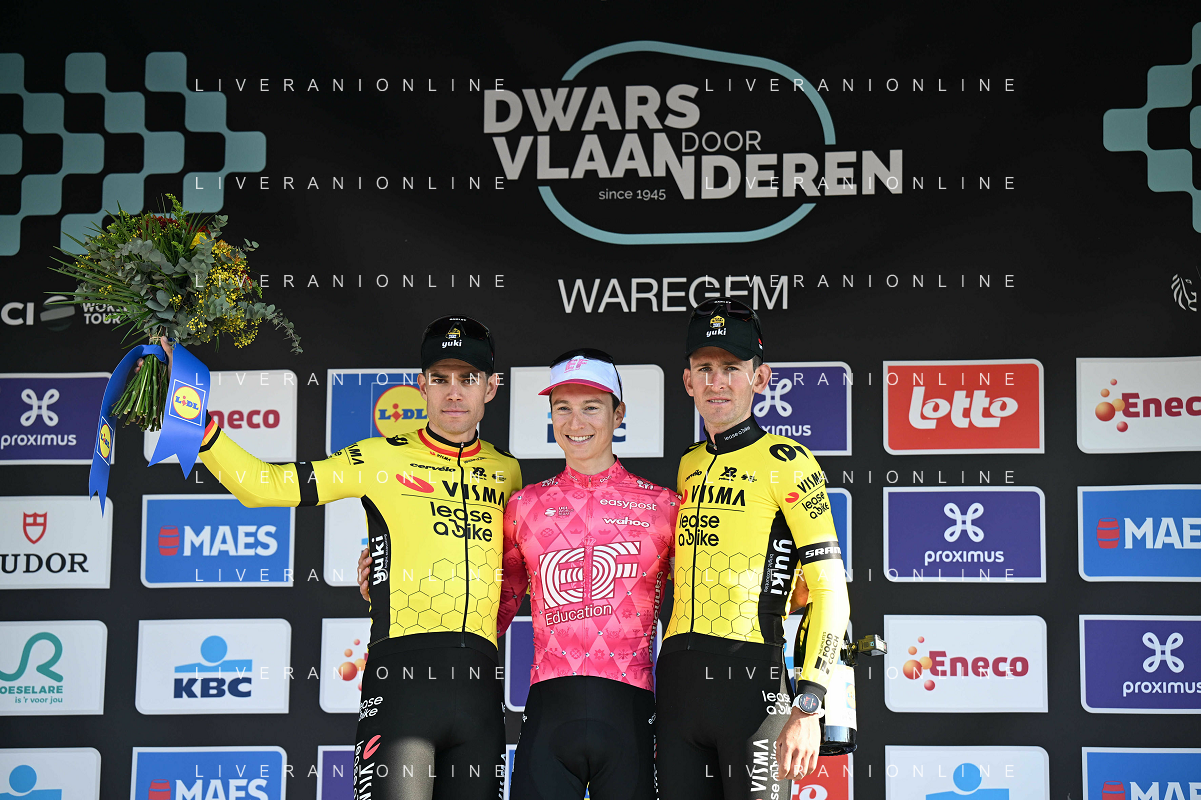 02-04-2025 Dwars Door Vlaanderen; 2025, Ef Education - Easypost; 2025, Visma - Lease A Bike; Powless, Neilson; Van Aert, Wout; Benoot, Tiesj; Jorgenson, Matteo; Waregem; ©SIROTTI - AGENZIA ALDO LIVERANI SAS