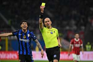 Milan vs Inter nella foto l'arbitro Michael Fabbri di Ravenna con il cartellino giallo Milano 02-04-2025 Stadio Giuseppe Meazza - San Siro Coppa Italia Frecciarossa - semifinale gara di andata foto Roberto Garavaglia/Agenzia Aldo Liverani sas- AGENZIA ALDO LIVERANI SAS