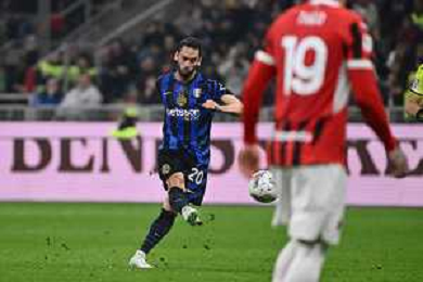 Milan vs Inter nella foto Hakan Calhanoglu (Inter) occasione da gol su calcio di punizione Milano 02-04-2025 Stadio Giuseppe Meazza - San Siro Coppa Italia Frecciarossa - semifinale gara di andata foto Roberto Garavaglia/Agenzia Aldo Liverani sas- AGENZIA ALDO LIVERANI SAS