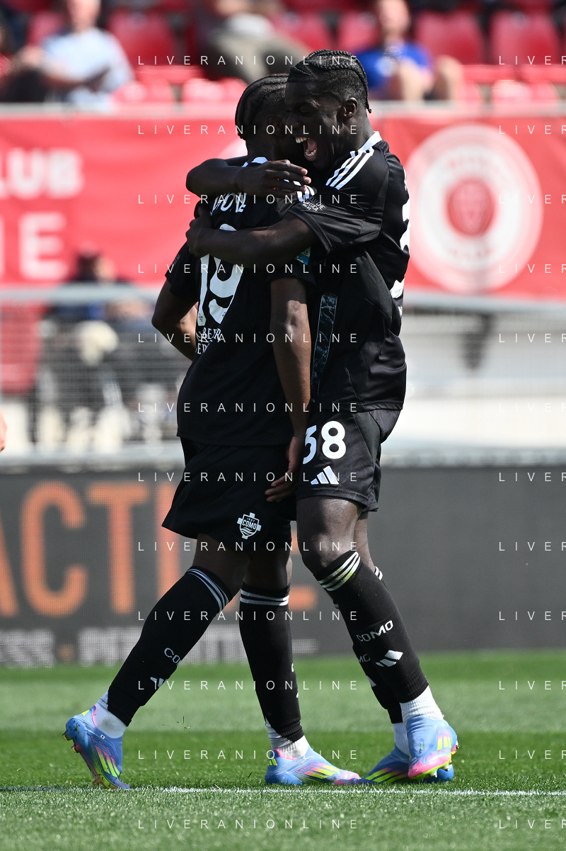TVRG Monza vs Como nella foto giocatori Como esultanza dopo il gol dell'1 a 1 Jonathan Ikone’ (Como) Monza 05-04-2025 U-Power Stadium Campionato Serie A Enilive - 31a giornata foto Roberto Garavaglia/Agenzia Aldo Liverani sas