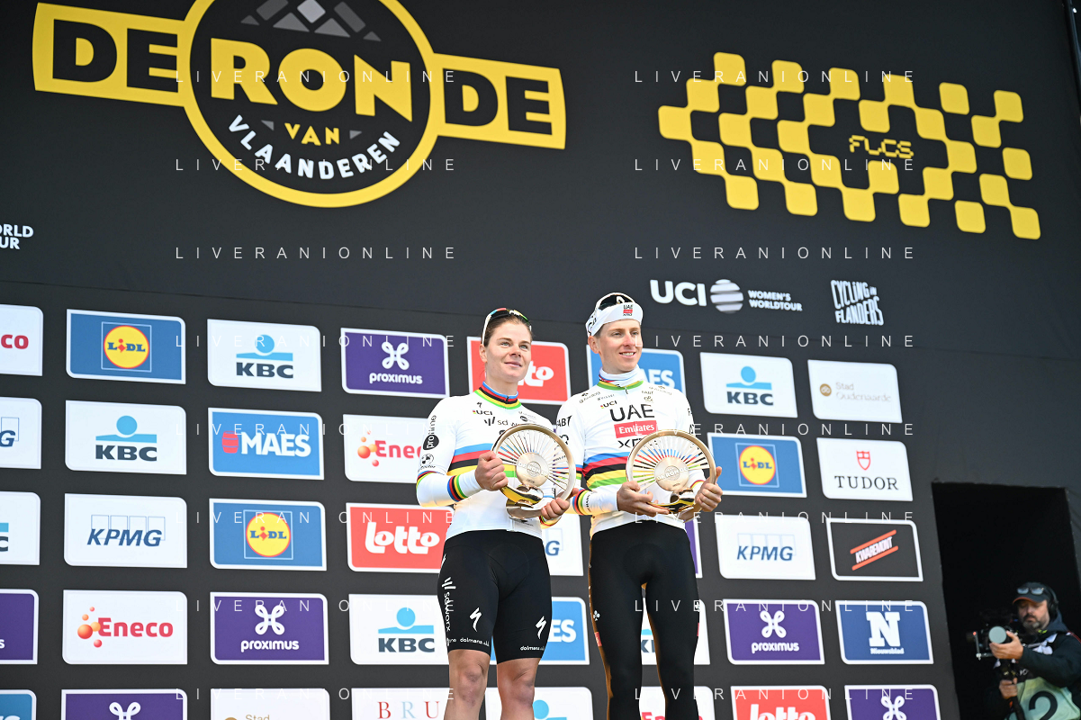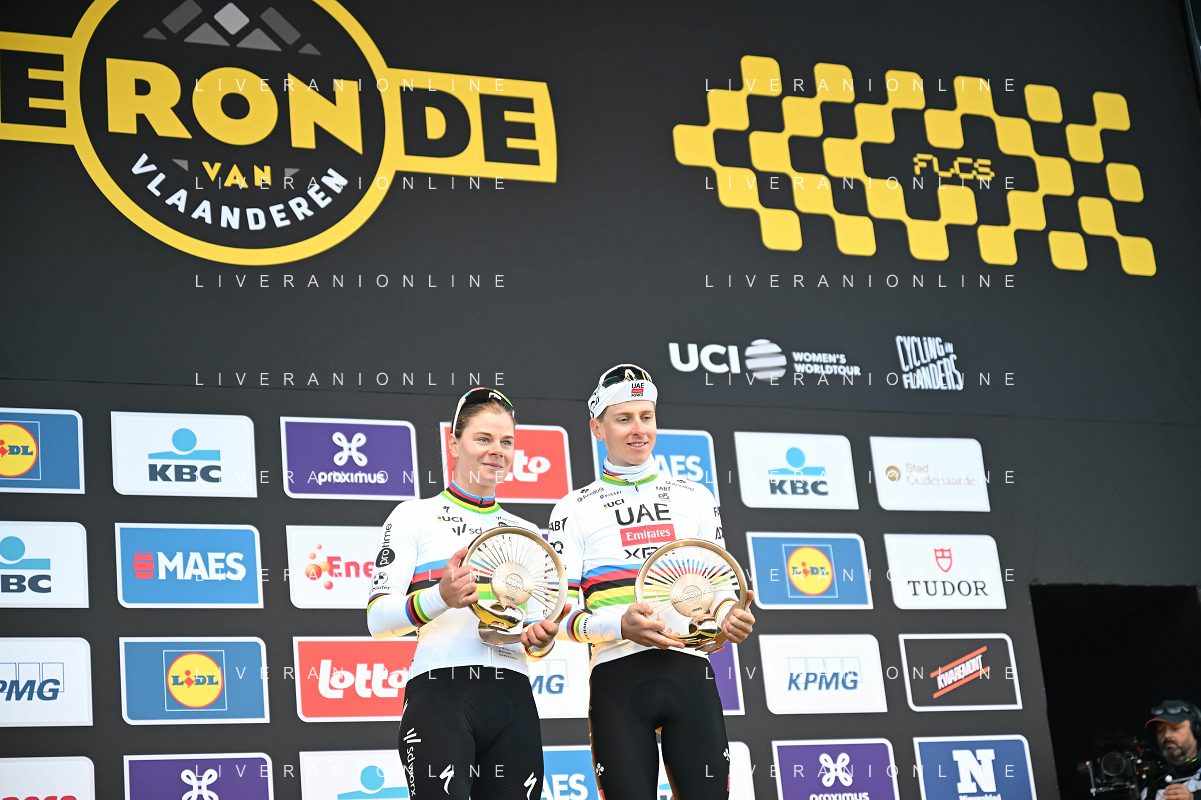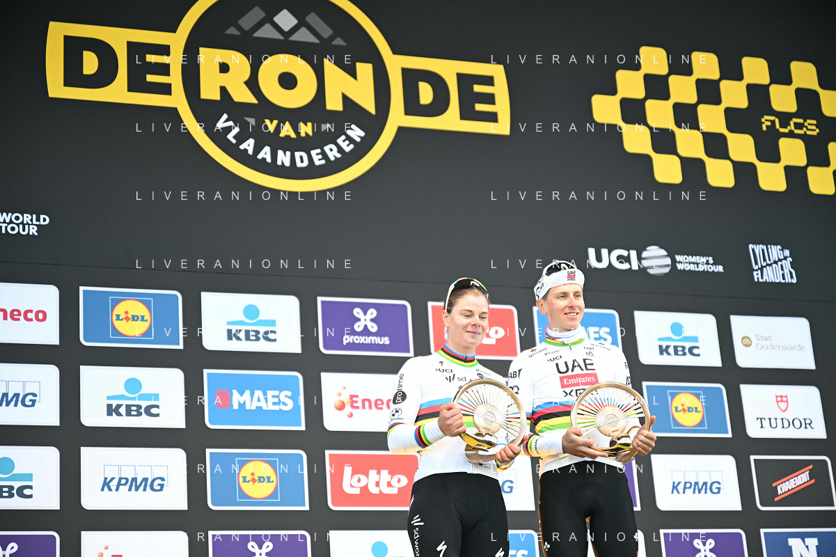 06-04-2025 Tour Des Flandres; 2025, Uae Team Emirates - Xrg; 2025, Sd Worx - Protime; Pogacar, Tadej; Kopecky, Lotte; Oudenaarde; ©SIROTTI - AGENZIA ALDO LIVERANI SAS