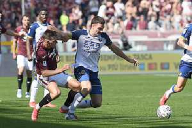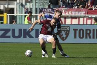Gvidas Gineitis of Torino FC competes for the ball with Antoine Bernède of Hellas Verona FC during Torino FC vs Hellas Verona FC, 31° Serie A Enilive 2024-25 game at Olimpic stadium - Grande Torino in Torino (TO), Italy, on April 06, 2025. (Photo by Davide Casentini)- AGENZIA ALDO LIVERANI SAS