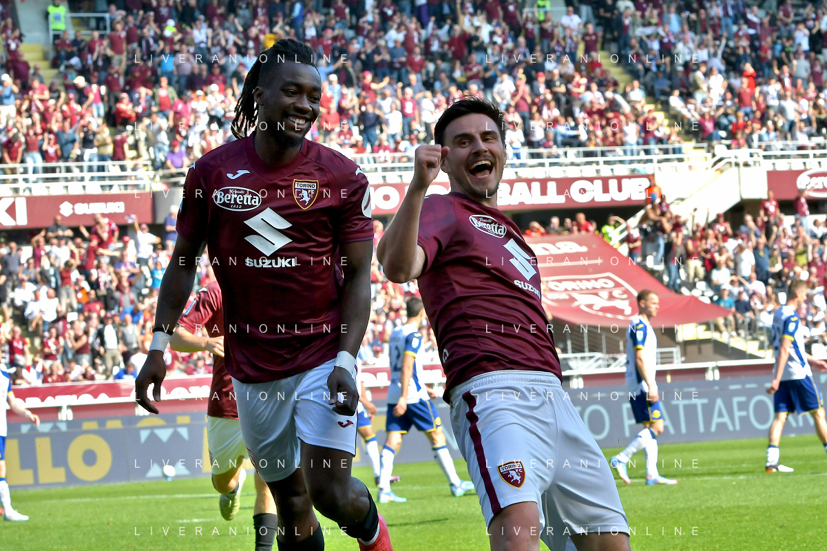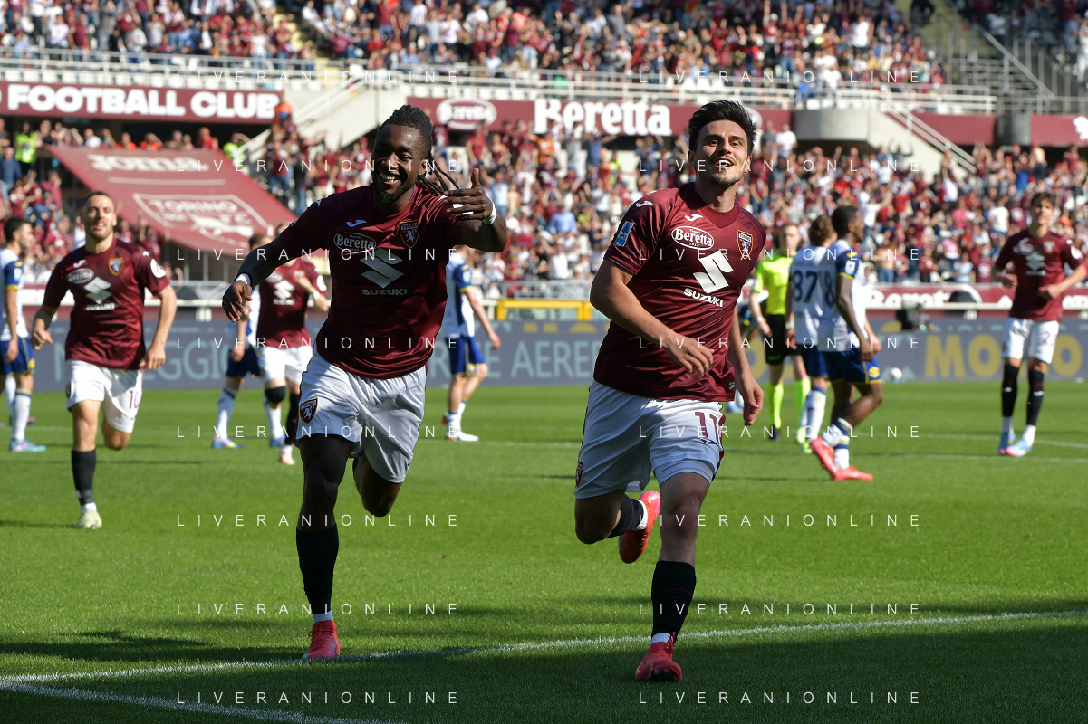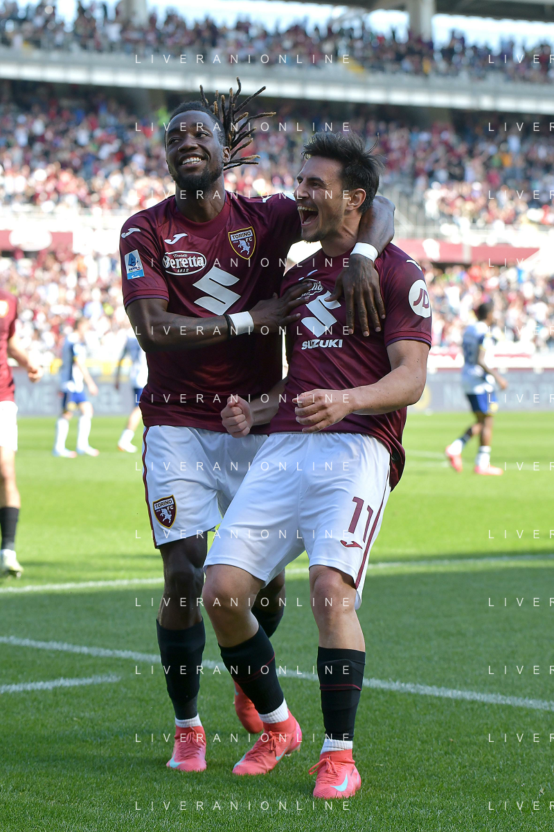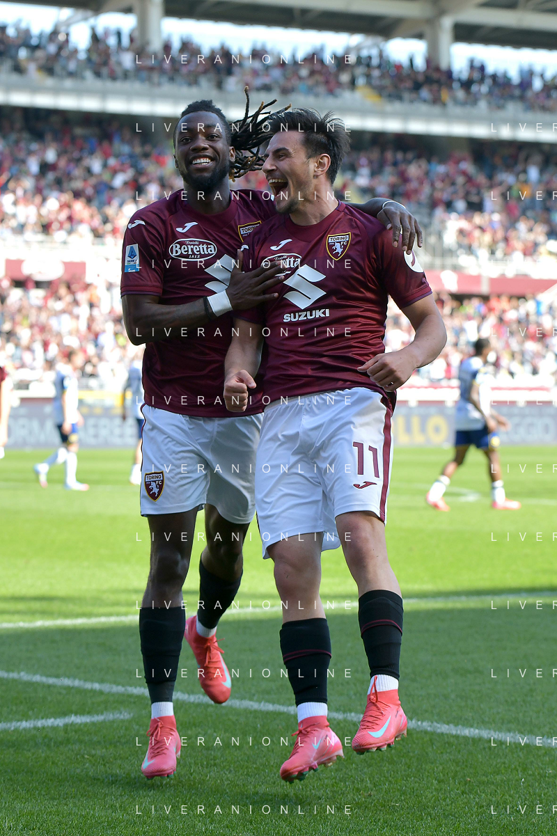 Eljif Elmas of Torino FC celebrates with Nikola Vlašić of Torino FC after goal during Torino FC vs Hellas Verona FC, 31° Serie A Enilive 2024-25 game at Olimpic stadium - Grande Torino in Torino (TO), Italy, on April 06, 2025. (Photo by Davide Casentini)- AGENZIA ALDO LIVERANI SAS