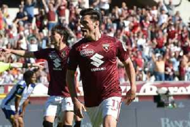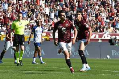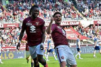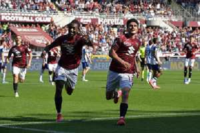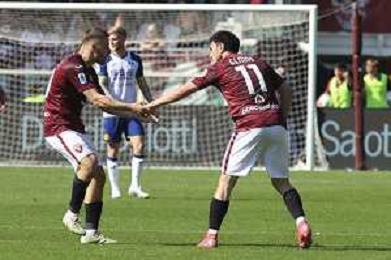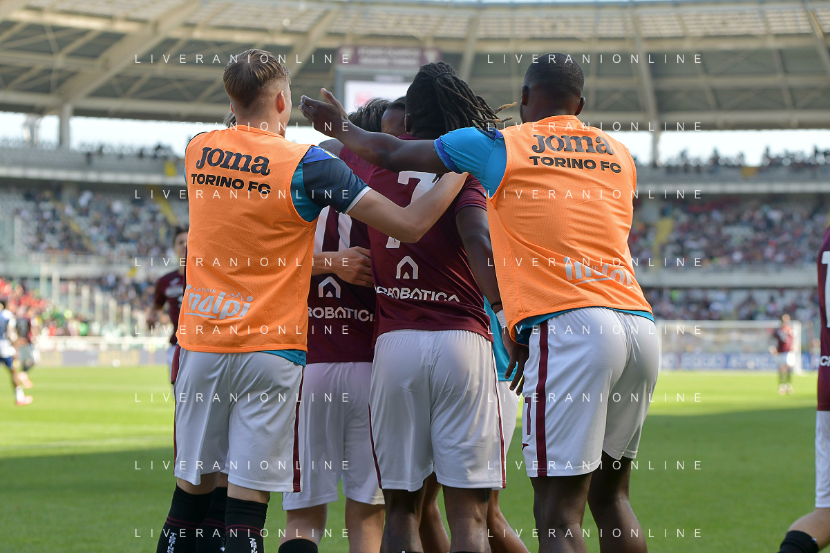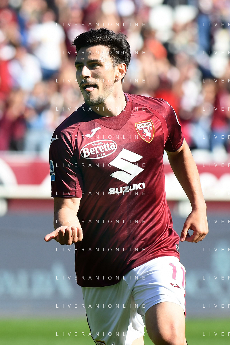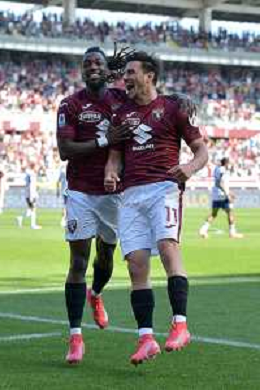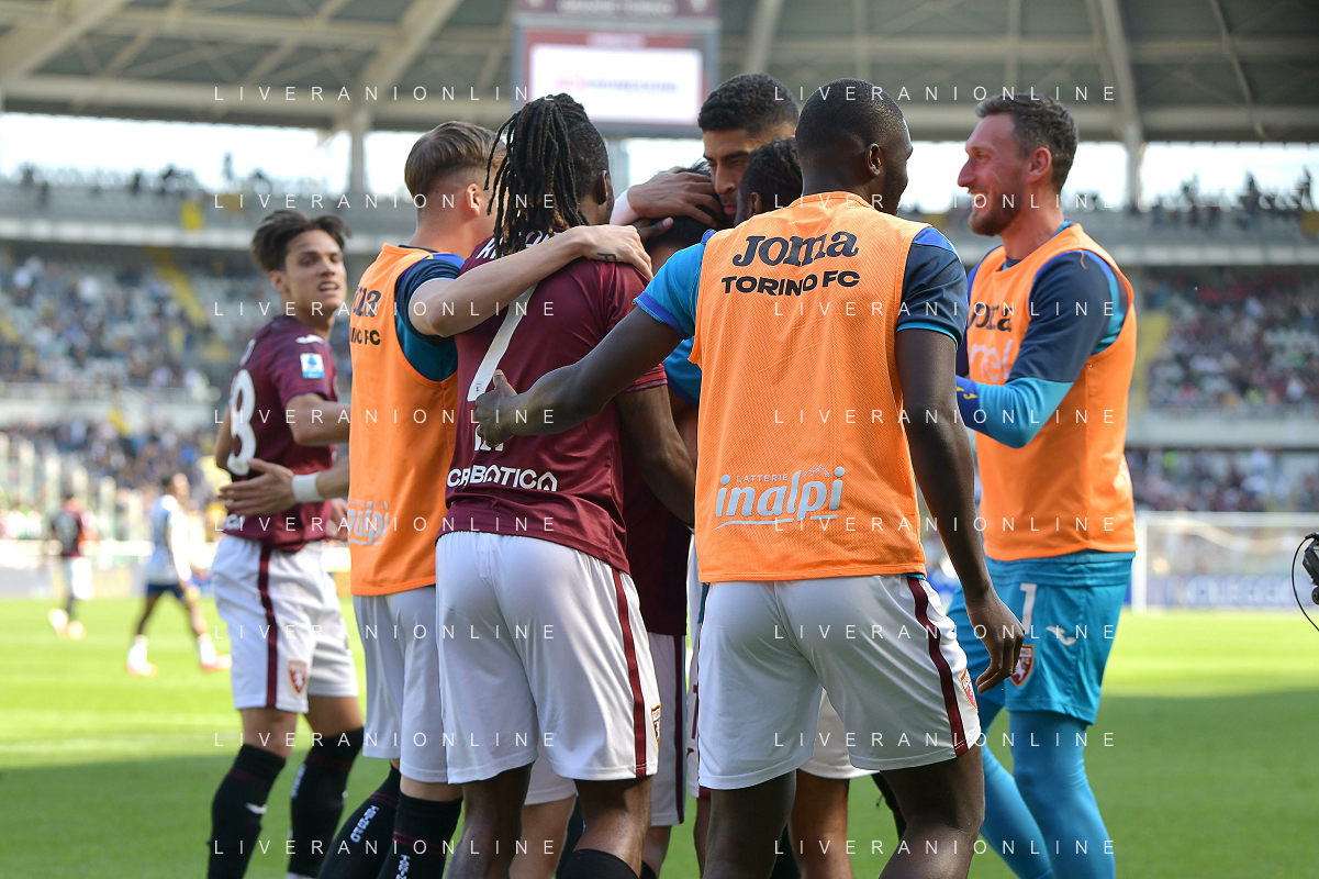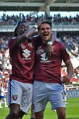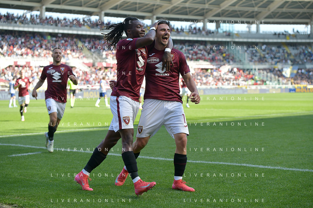 Eljif Elmas of Torino FC celebrates with Nikola Vlašić of Torino FC after goal during Torino FC vs Hellas Verona FC, 31° Serie A Enilive 2024-25 game at Olimpic stadium - Grande Torino in Torino (TO), Italy, on April 06, 2025. (Photo by Davide Casentini)- AGENZIA ALDO LIVERANI SAS