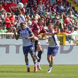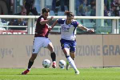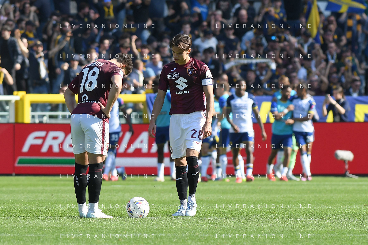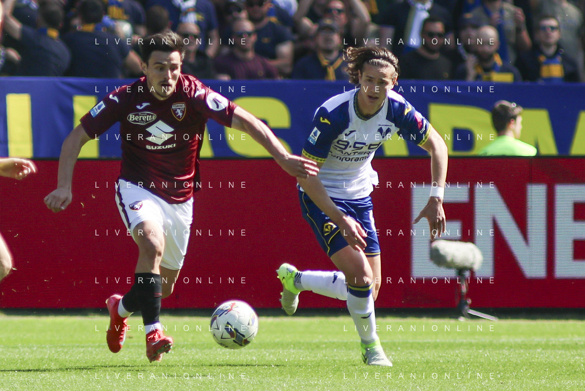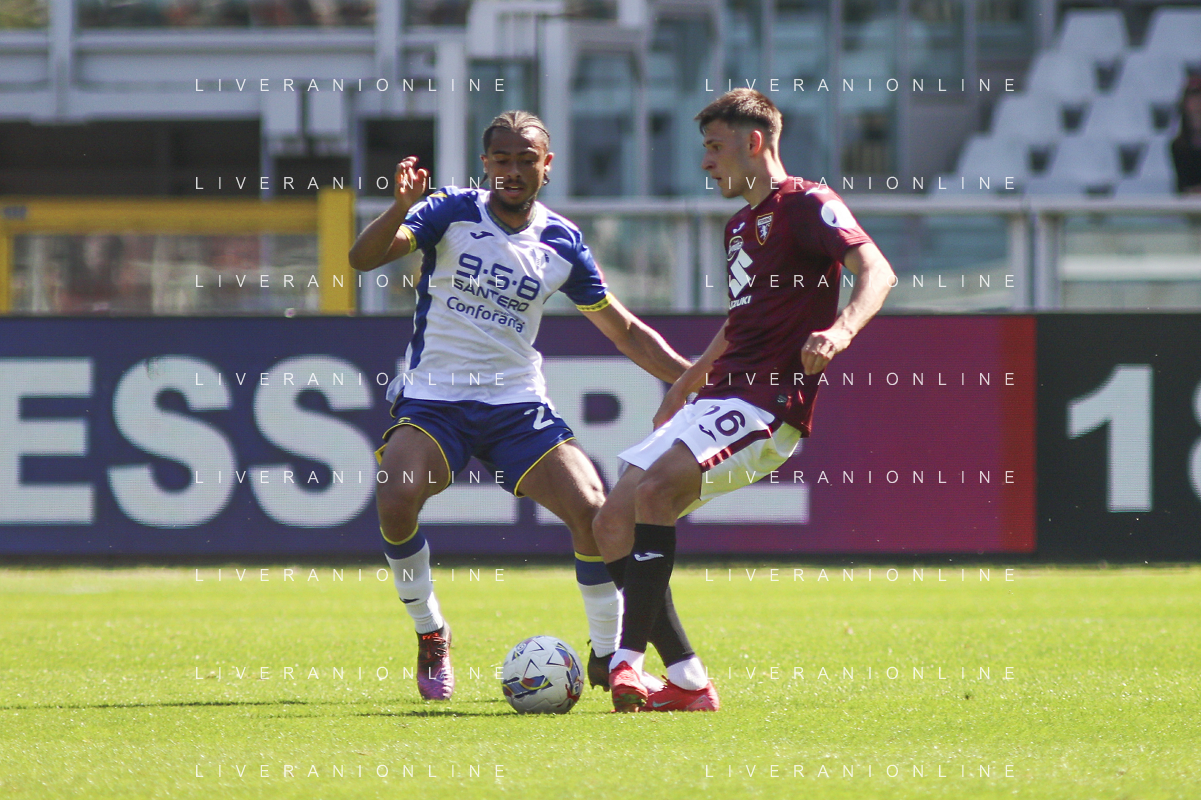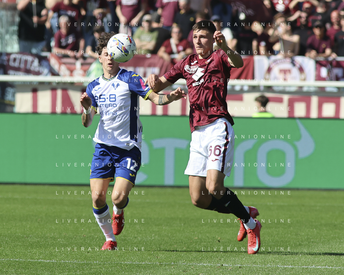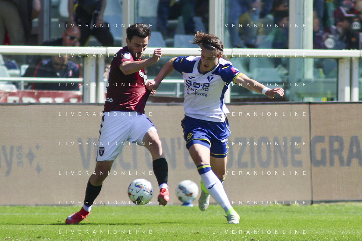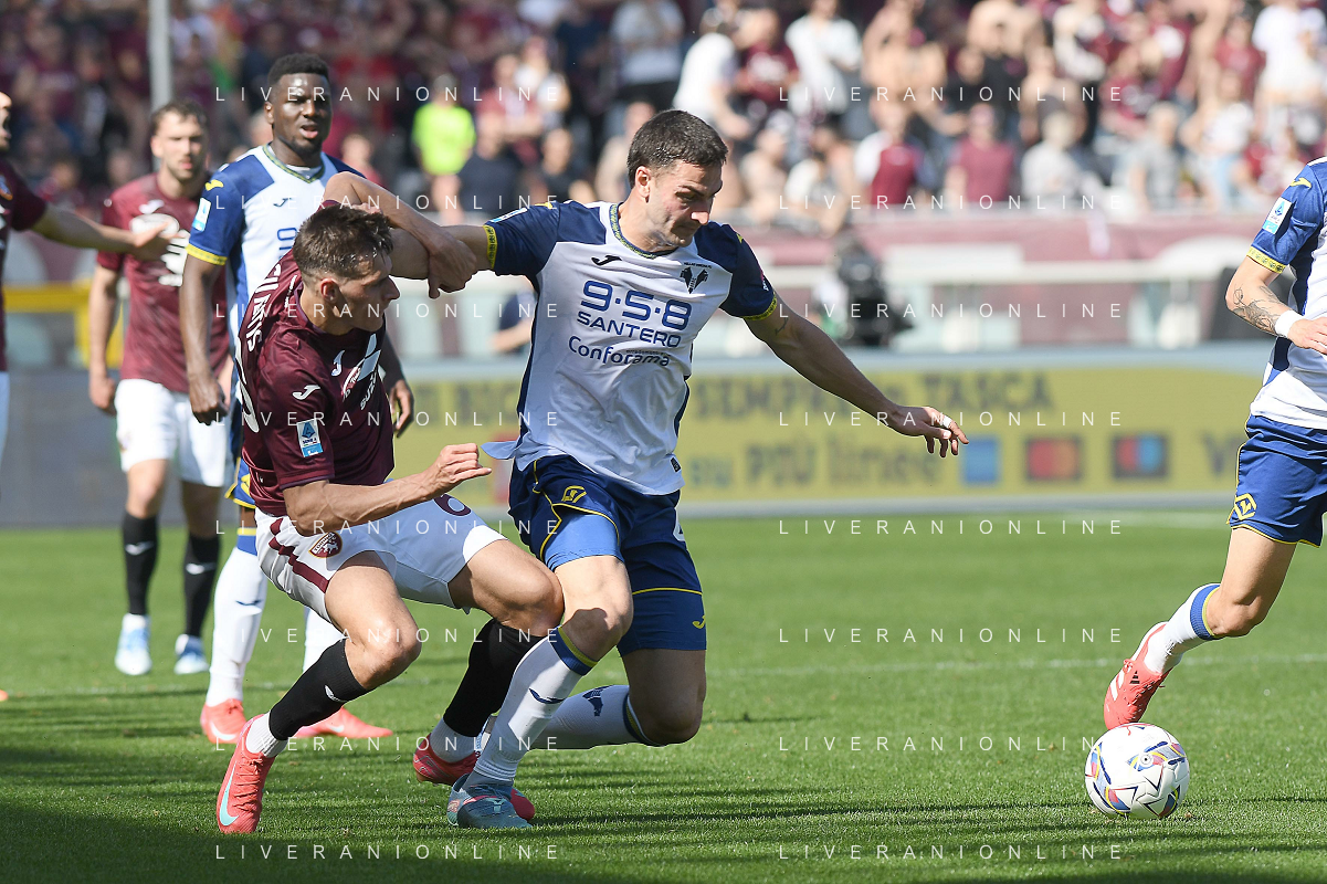 Diego Coppola of Hellas Verona FC battle for the ball with Nikola Vlašić of Torino FC during Torino FC vs Hellas Verona FC, 31° Serie A Enilive 2024-25 game at Olimpic stadium - Grande Torino in Torino (TO), Italy, on April 06, 2025. (Photo by Davide Casentini)- AGENZIA ALDO LIVERANI SAS