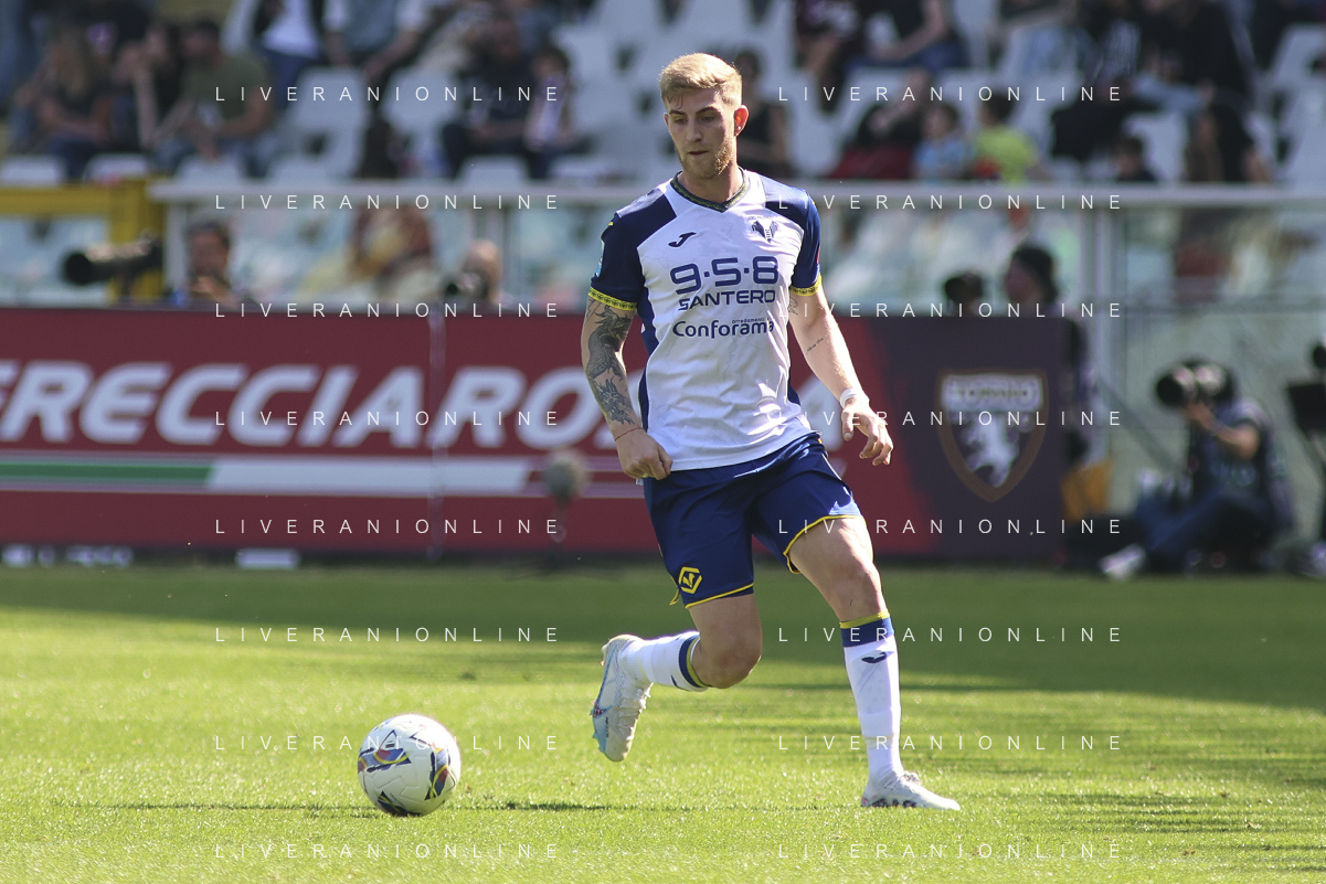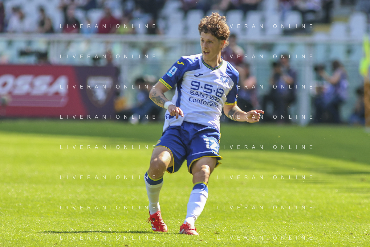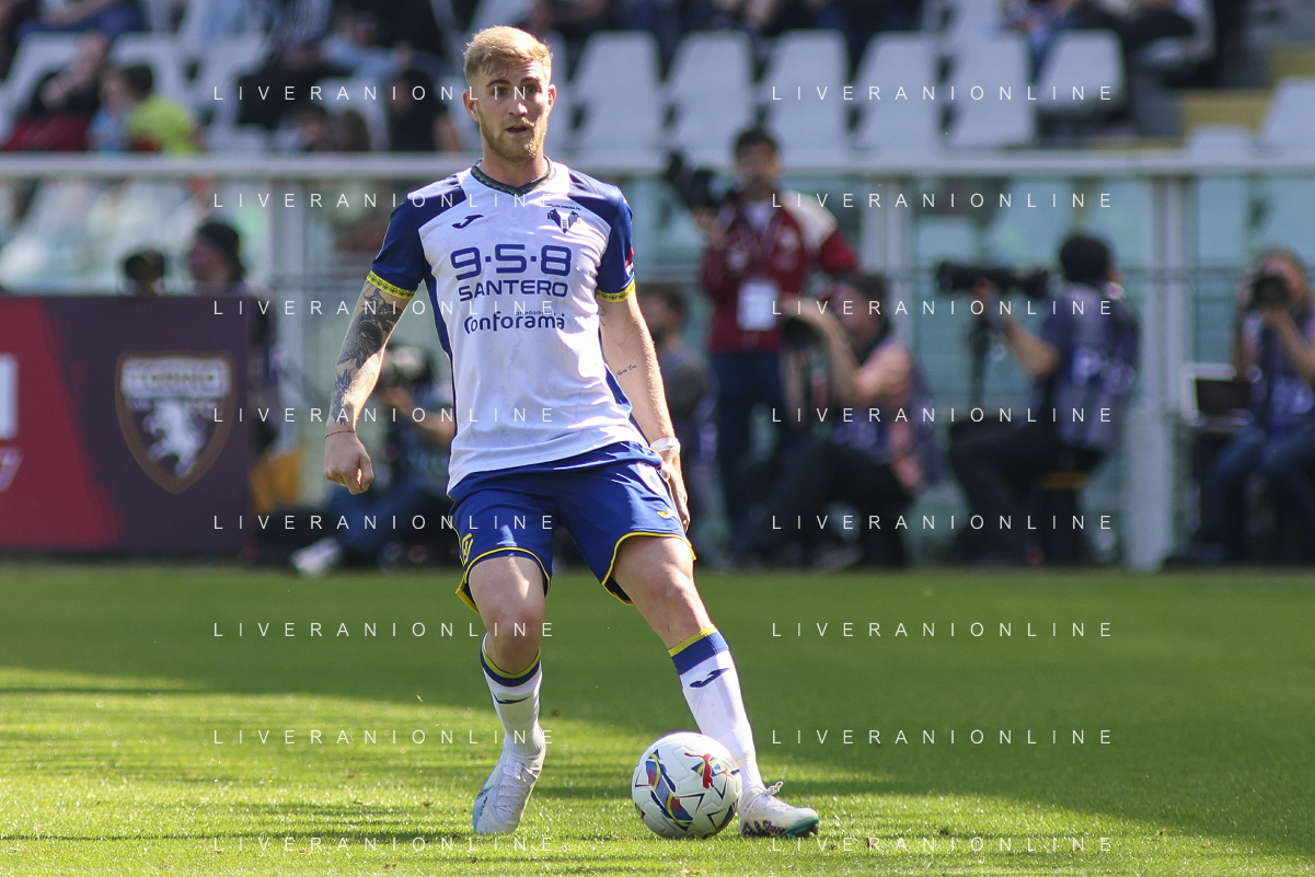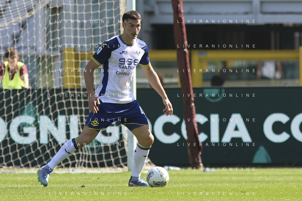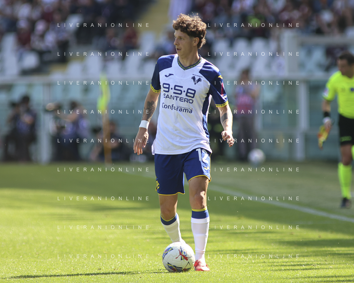 Diego Coppola of Hellas Verona FC play the ball during Torino FC vs Hellas Verona FC, 31° Serie A Enilive 2024-25 game at Olimpic stadium - Grande Torino in Torino (TO), Italy, on April 06, 2025. (Photo by Davide Casentini)- AGENZIA ALDO LIVERANI SAS