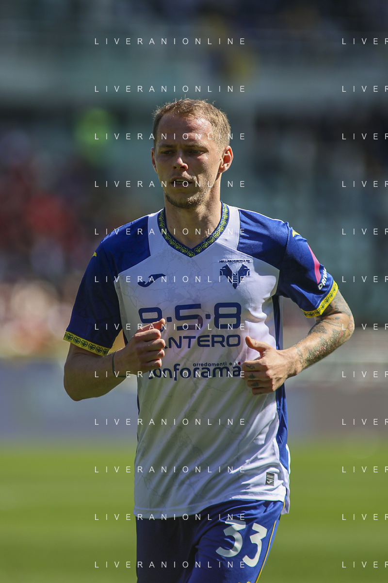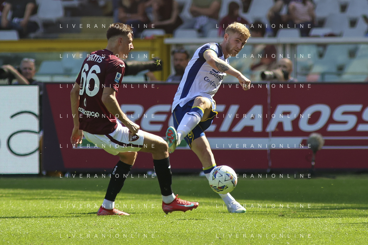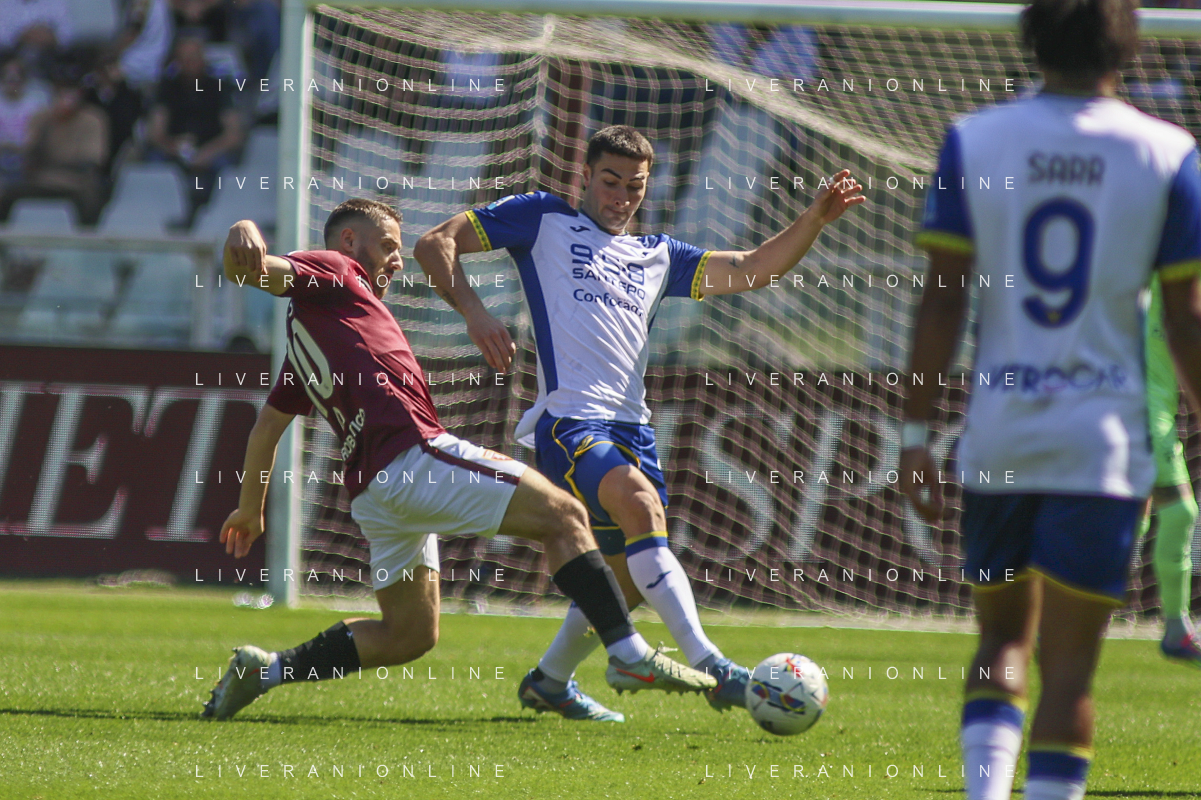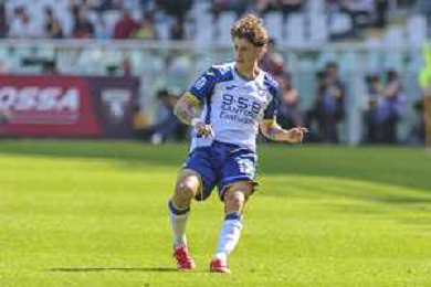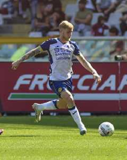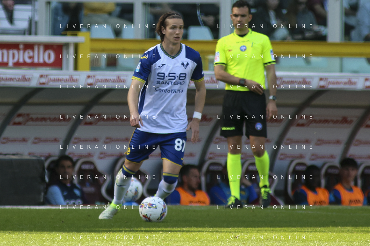Diego Coppola of Hellas Verona FC play the ball during Torino FC vs Hellas Verona FC, 31° Serie A Enilive 2024-25 game at Olimpic stadium - Grande Torino in Torino (TO), Italy, on April 06, 2025. (Photo by Davide Casentini)- AGENZIA ALDO LIVERANI SAS