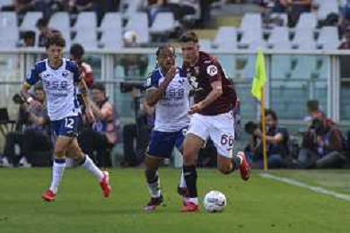 Saul Coco of Torino FC battle for the ball with Amin Sarr of Hellas Verona FC during Torino FC vs Hellas Verona FC, 31° Serie A Enilive 2024-25 game at Olimpic stadium - Grande Torino in Torino (TO), Italy, on April 06, 2025. (Photo by Davide Casentini)- AGENZIA ALDO LIVERANI SAS