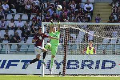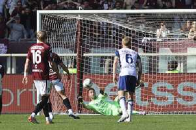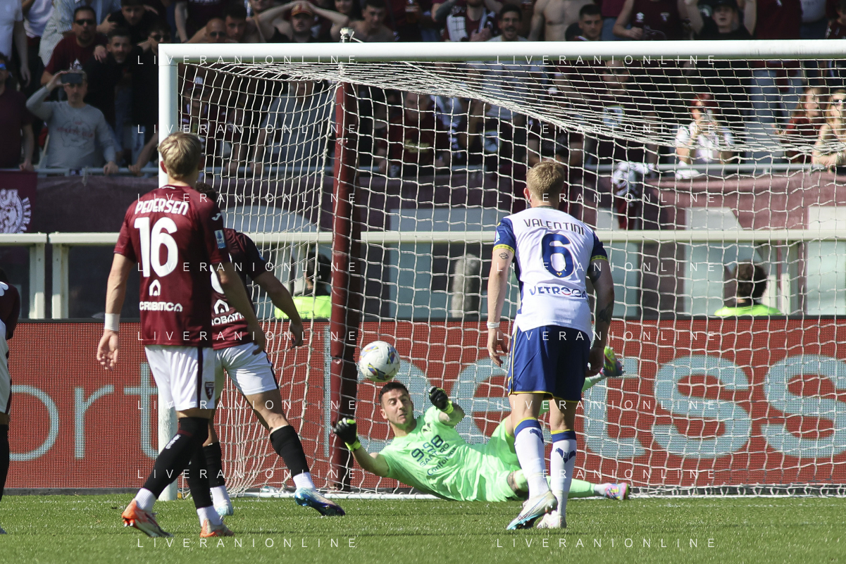 Lorenzo Montipo’ of Hellas Verona FC makes a save on Ché Adams of Torino FC penalty during Torino FC vs Hellas Verona FC, 31° Serie A Enilive 2024-25 game at Olimpic stadium - Grande Torino in Torino (TO), Italy, on April 06, 2025. (Photo by Davide Casentini)- AGENZIA ALDO LIVERANI SAS