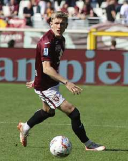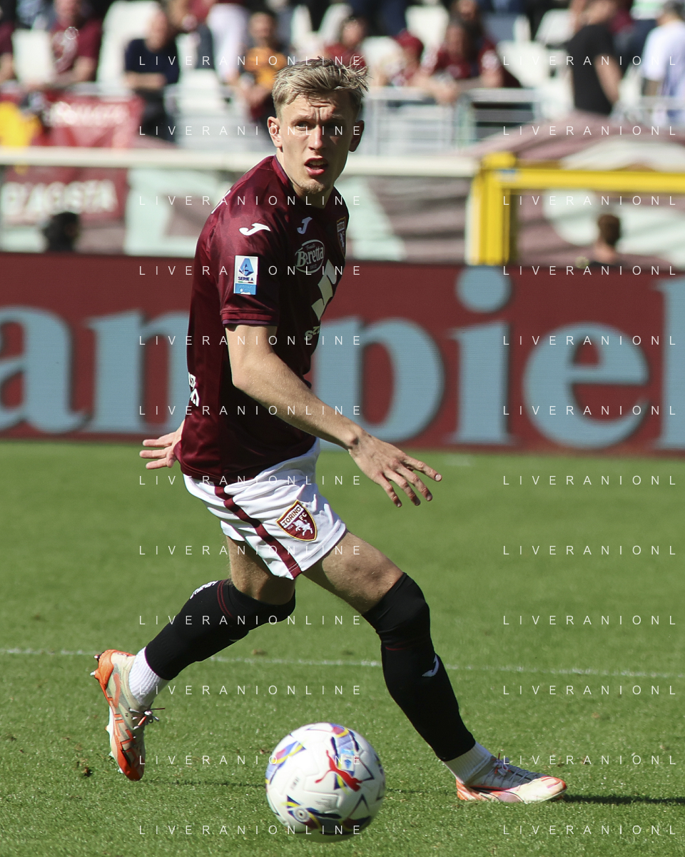 Marcus Holmgren Pedersen of Torino FC play the ball during Torino FC vs Hellas Verona FC, 31° Serie A Enilive 2024-25 game at Olimpic stadium - Grande Torino in Torino (TO), Italy, on April 06, 2025. (Photo by Davide Casentini)- AGENZIA ALDO LIVERANI SAS