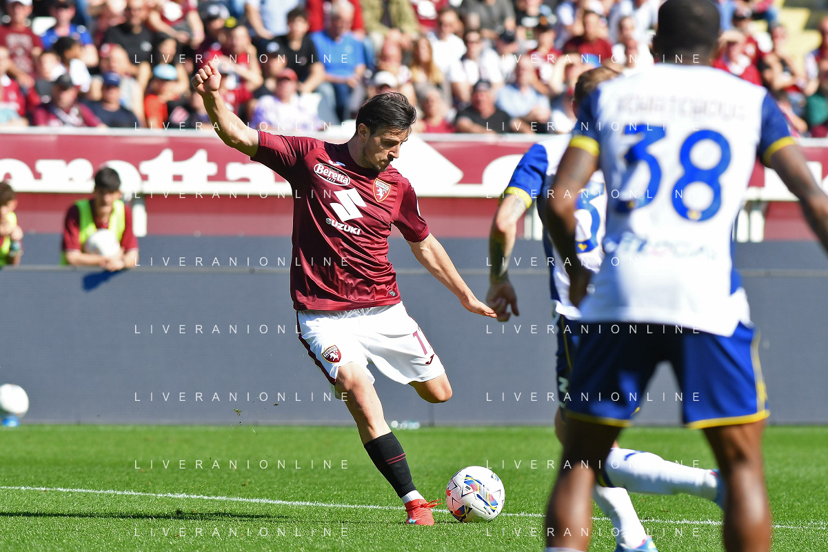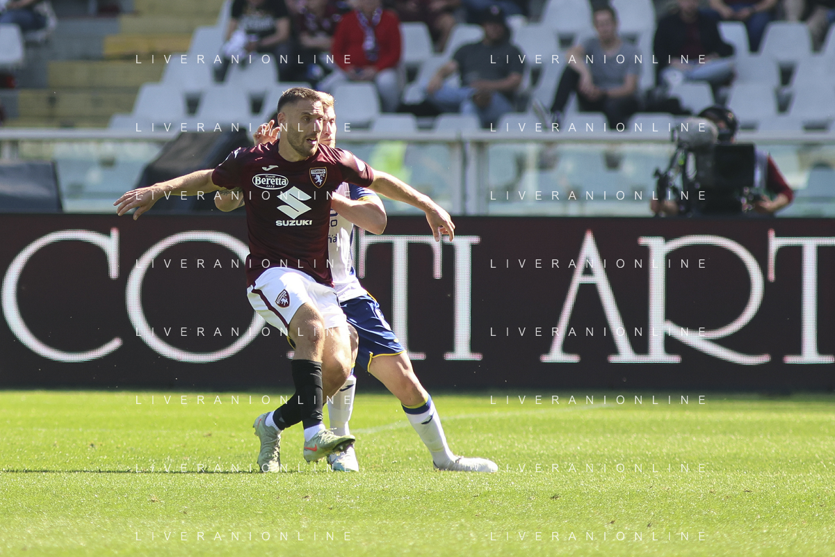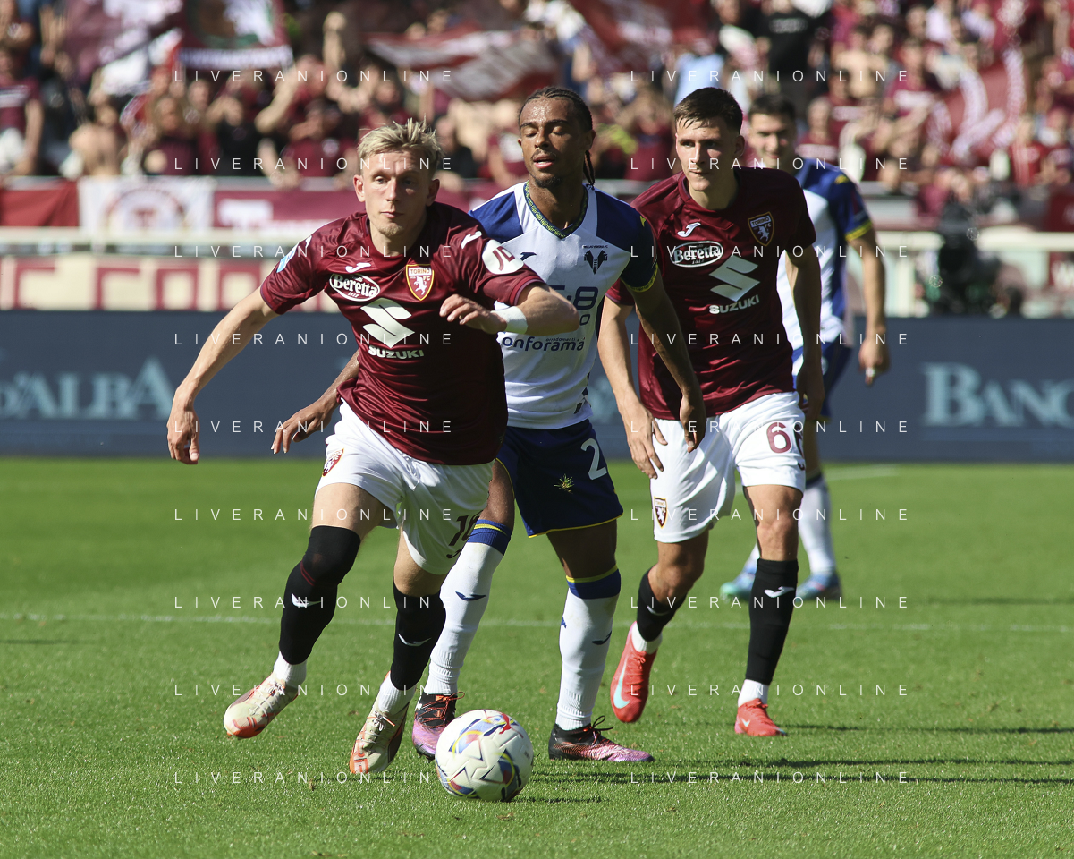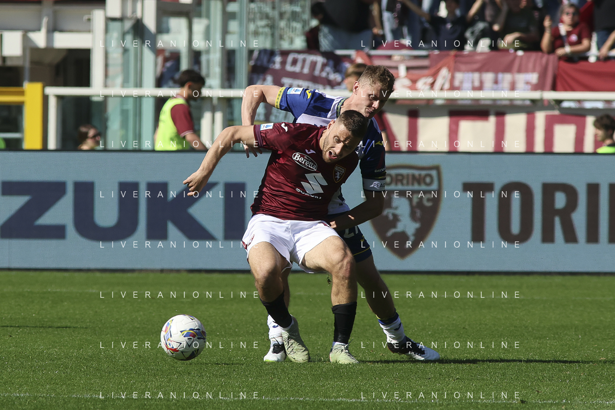 Nikola Vlasic of Torino FC battle for the ball with Pawel Dawidowicz of Hellas Verona FC during Torino FC vs Hellas Verona FC, 31° Serie A Enilive 2024-25 game at Olimpic stadium - Grande Torino in Torino (TO), Italy, on April 06, 2025. (Photo by Davide Casentini)- AGENZIA ALDO LIVERANI SAS