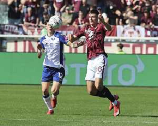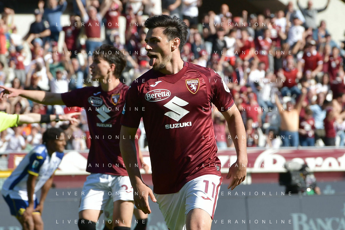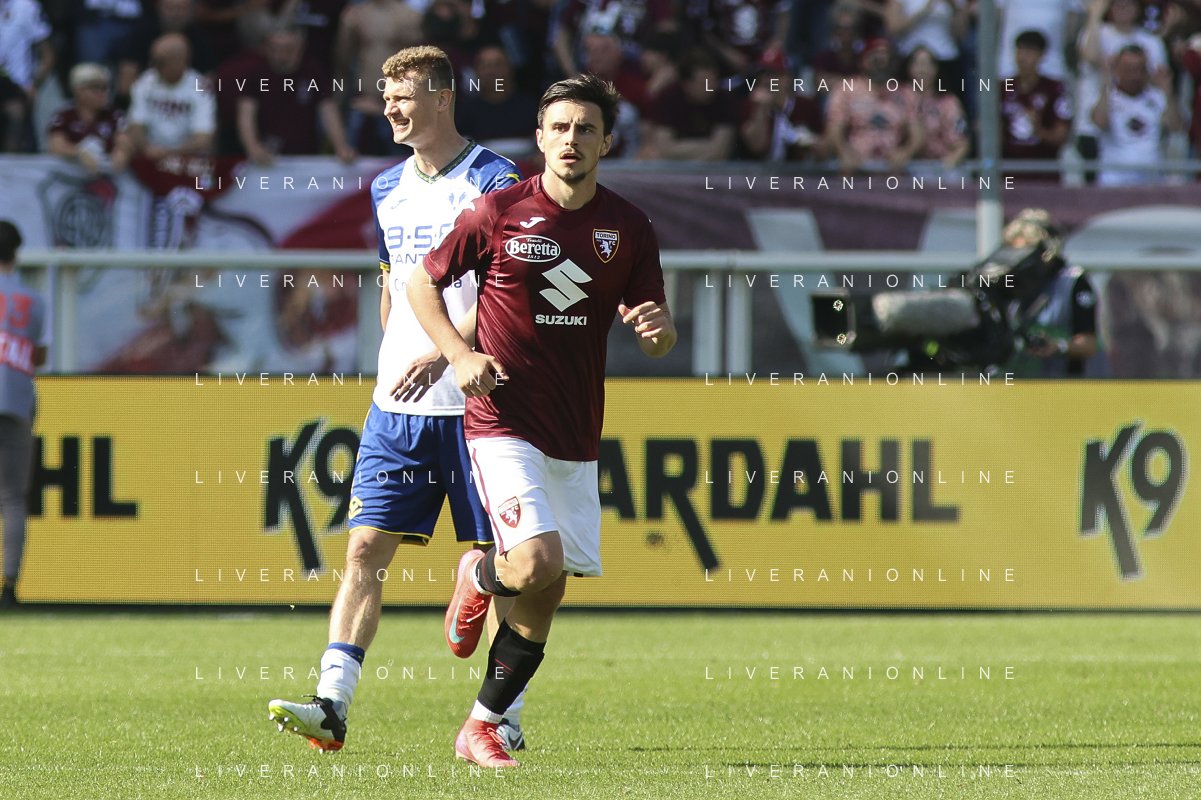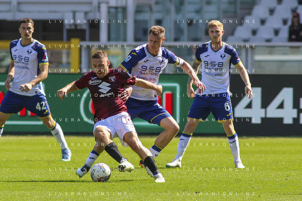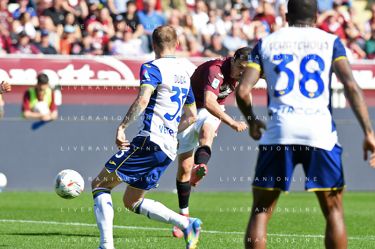Nikola Vlasic of Torino FC battle for the ball with Pawel Dawidowicz of Hellas Verona FC during Torino FC vs Hellas Verona FC, 31° Serie A Enilive 2024-25 game at Olimpic stadium - Grande Torino in Torino (TO), Italy, on April 06, 2025. (Photo by Davide Casentini)- AGENZIA ALDO LIVERANI SAS