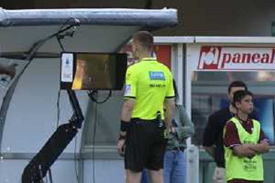 Arbitro - the Referee Kevin Bonavina see the var during Torino FC vs Hellas Verona FC, 31° Serie A Enilive 2024-25 game at Olimpic stadium - Grande Torino in Torino (TO), Italy, on April 06, 2025. (Photo by Davide Casentini)- AGENZIA ALDO LIVERANI SAS
