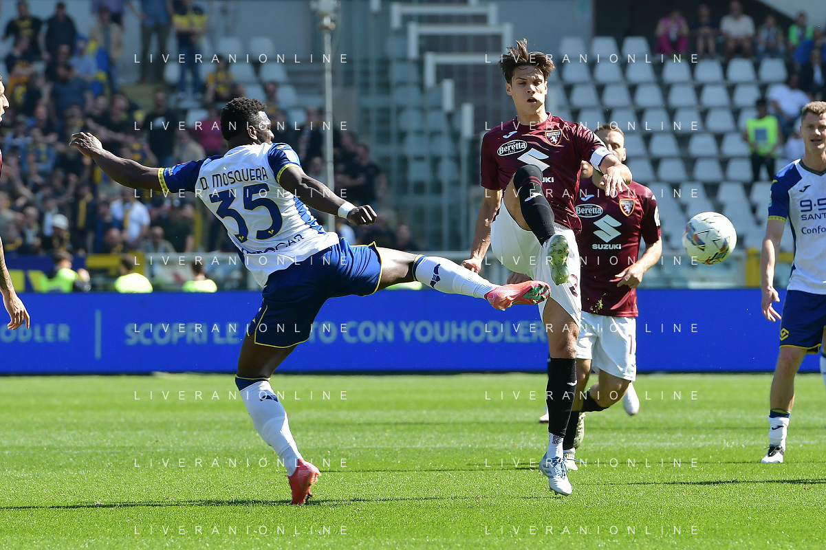 Daniel Mosquera of Hellas Verona FC play the ball during Torino FC vs Hellas Verona FC, 31° Serie A Enilive 2024-25 game at Olimpic stadium - Grande Torino in Torino (TO), Italy, on April 06, 2025. (Photo by Davide Casentini)- AGENZIA ALDO LIVERANI SAS