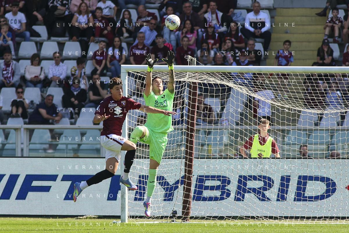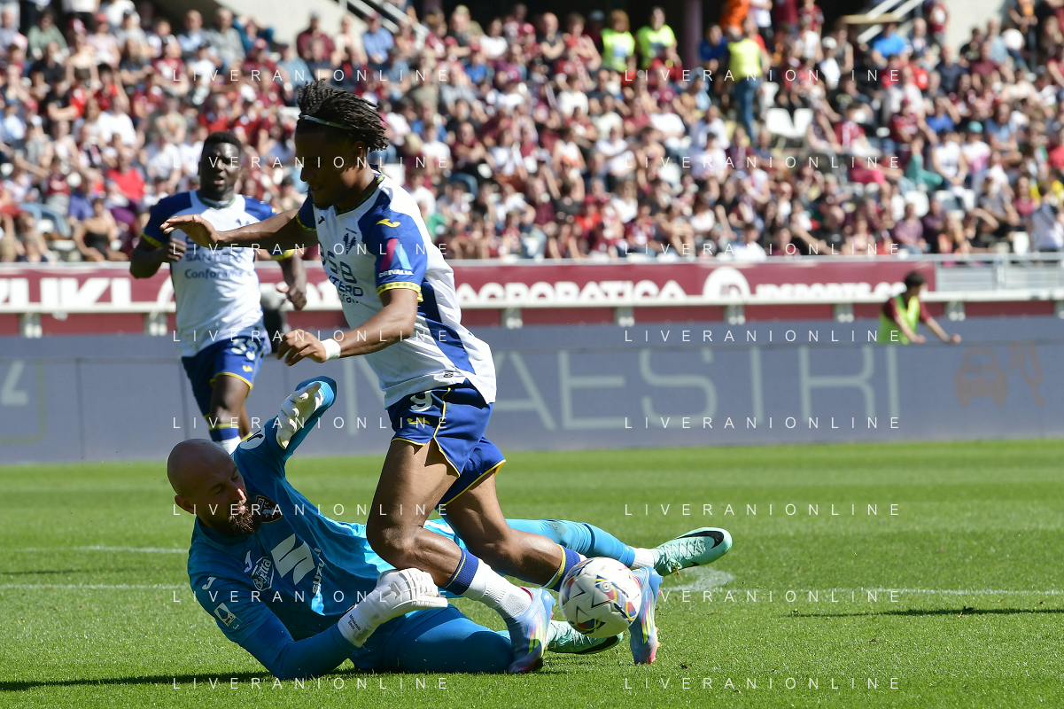 Lorenzo Montipo’ of Hellas Verona FC makes a save on Cesare Casadei of Torino FC during Torino FC vs Hellas Verona FC, 31° Serie A Enilive 2024-25 game at Olimpic stadium - Grande Torino in Torino (TO), Italy, on April 06, 2025. (Photo by Davide Casentini)- AGENZIA ALDO LIVERANI SAS