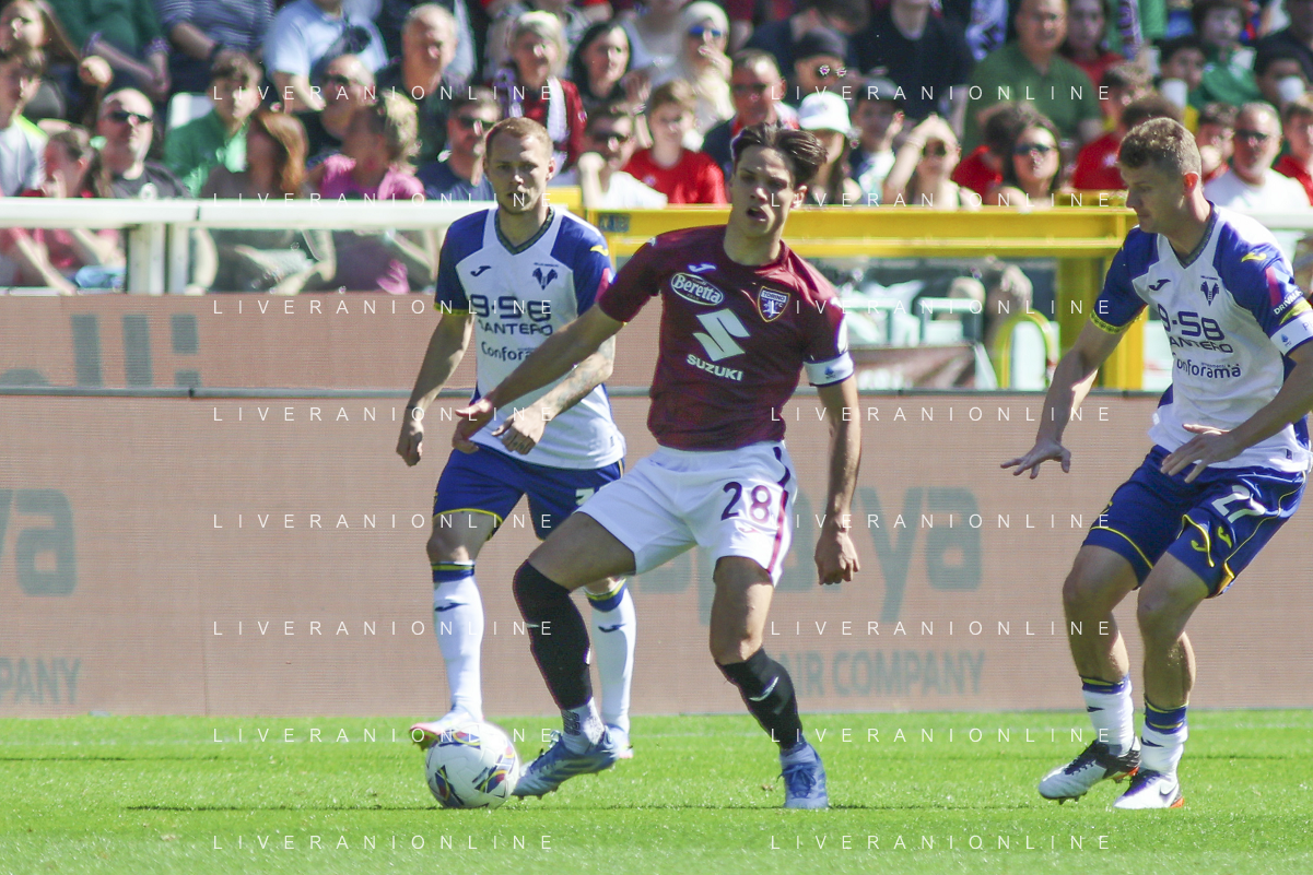 Cesare Casadei of Torino FC battle for the ball with Jackson Tchatchoua of Hellas Verona FC and Pawel Dawidowicz of Hellas Verona FC during Torino FC vs Hellas Verona FC, 31° Serie A Enilive 2024-25 game at Olimpic stadium - Grande Torino in Torino (TO), Italy, on April 06, 2025. (Photo by Davide Casentini)- AGENZIA ALDO LIVERANI SAS