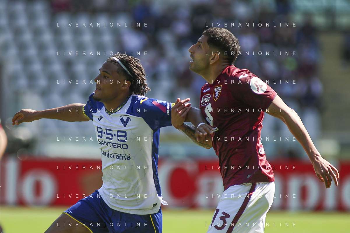 Jackson Tchatchoua of Hellas Verona FC battle for the ball with Cristiano Biraghi of Torino FC during Torino FC vs Hellas Verona FC, 31° Serie A Enilive 2024-25 game at Olimpic stadium - Grande Torino in Torino (TO), Italy, on April 06, 2025. (Photo by Davide Casentini)- AGENZIA ALDO LIVERANI SAS