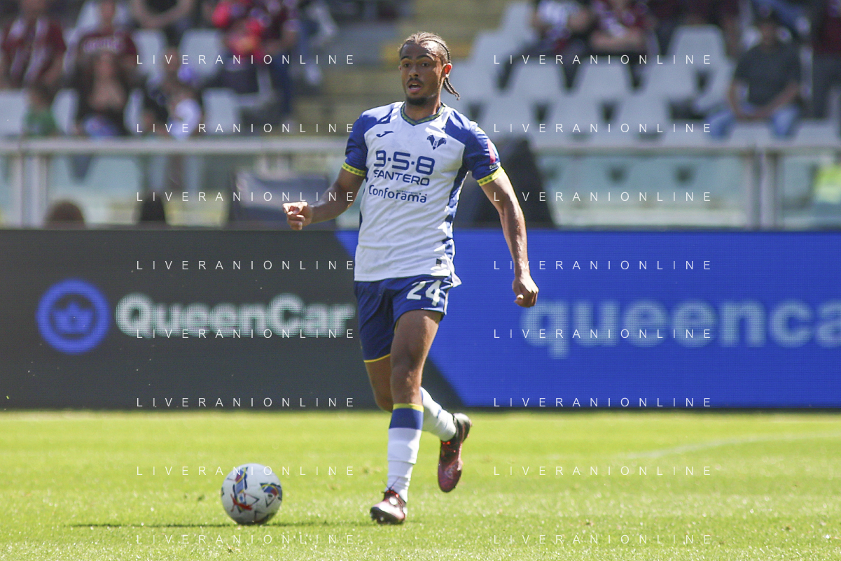 Cheikh Niasse of Hellas Verona FC play the ball during Torino FC vs Hellas Verona FC, 31° Serie A Enilive 2024-25 game at Olimpic stadium - Grande Torino in Torino (TO), Italy, on April 06, 2025. (Photo by Davide Casentini)- AGENZIA ALDO LIVERANI SAS