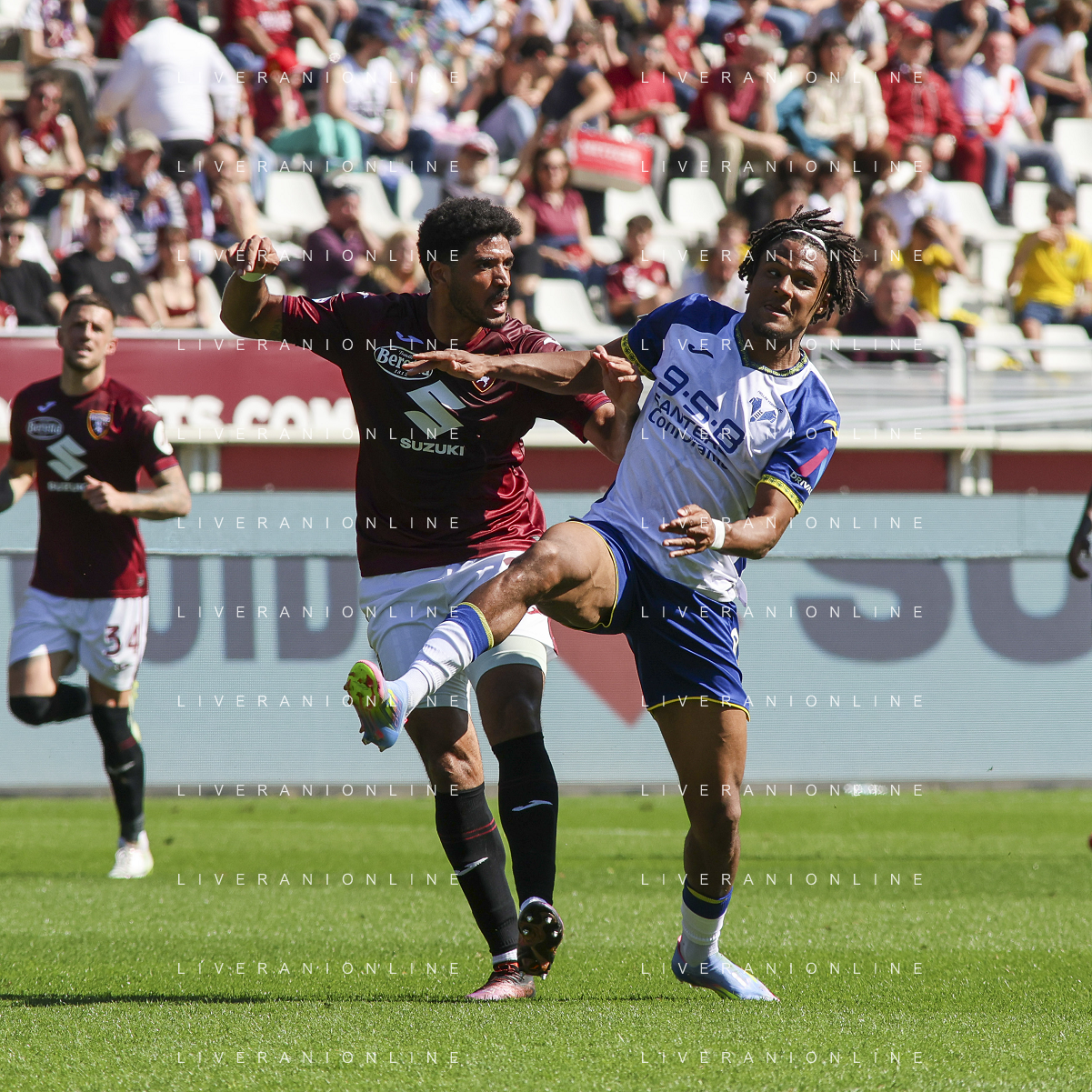 Domagoj Bradaric of Hellas Verona FC battle for the ball with Gvidas Gineitis of Torino FC during Torino FC vs Hellas Verona FC, 31° Serie A Enilive 2024-25 game at Olimpic stadium - Grande Torino in Torino (TO), Italy, on April 06, 2025. (Photo by Davide Casentini)- AGENZIA ALDO LIVERANI SAS