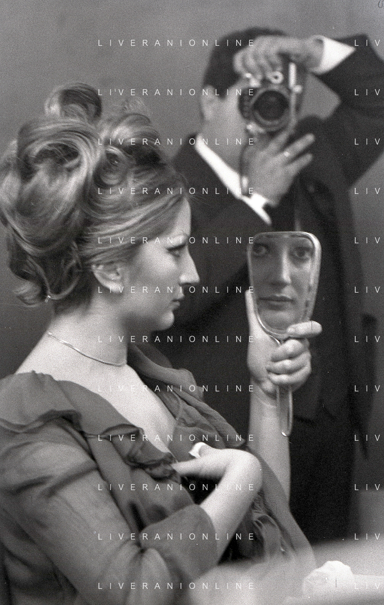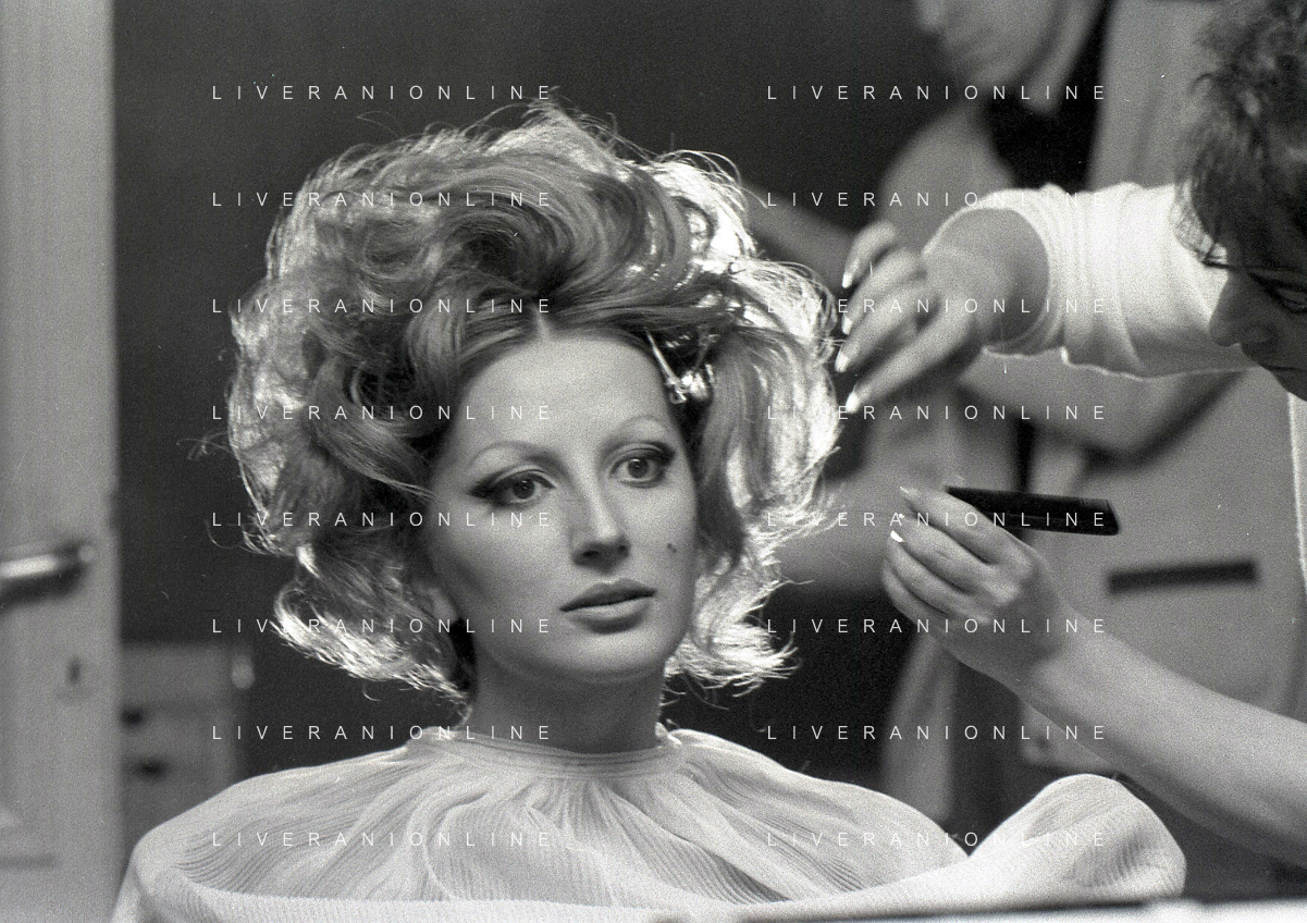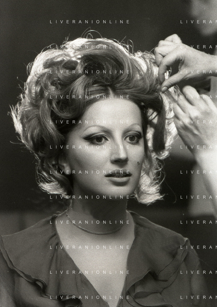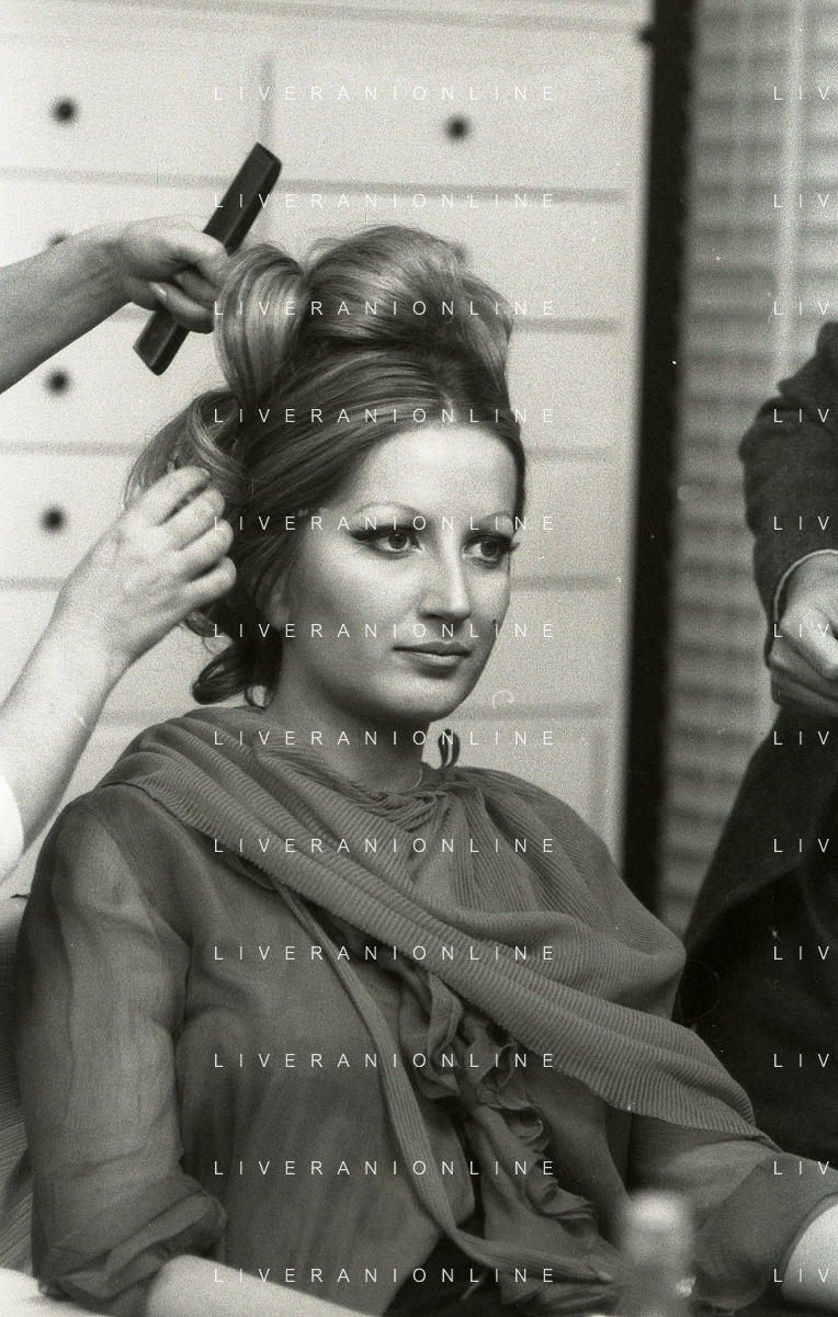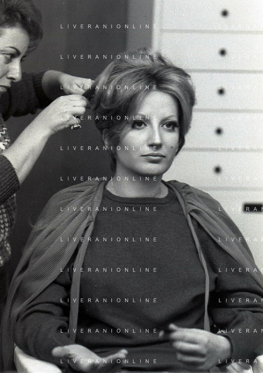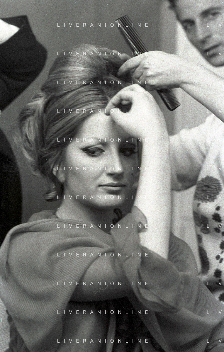 NEG-RETROSPETTIVA MINA MAZZINI CANTANTE NELLA FOTO MINA MAZZINI AL TRUCCO COL PARRUCCHIERE NELL'ANNO 1965 FOTO PIERO PASCUTTINI-ARCHIVIO GIOVANNI LIVERANI-AG ALDO LIVERANI SAS
