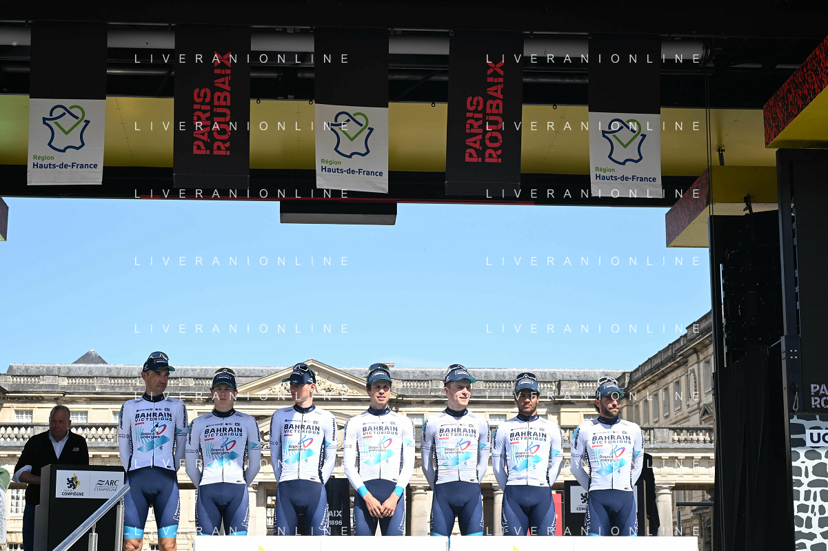 12-04-2025 Presentazione Squadre Paris - Roubaix 2025; 2025, Bahrain - Victorious; Compiegne; ©SIROTTI - AGENZIA ALDO LIVERANI SAS